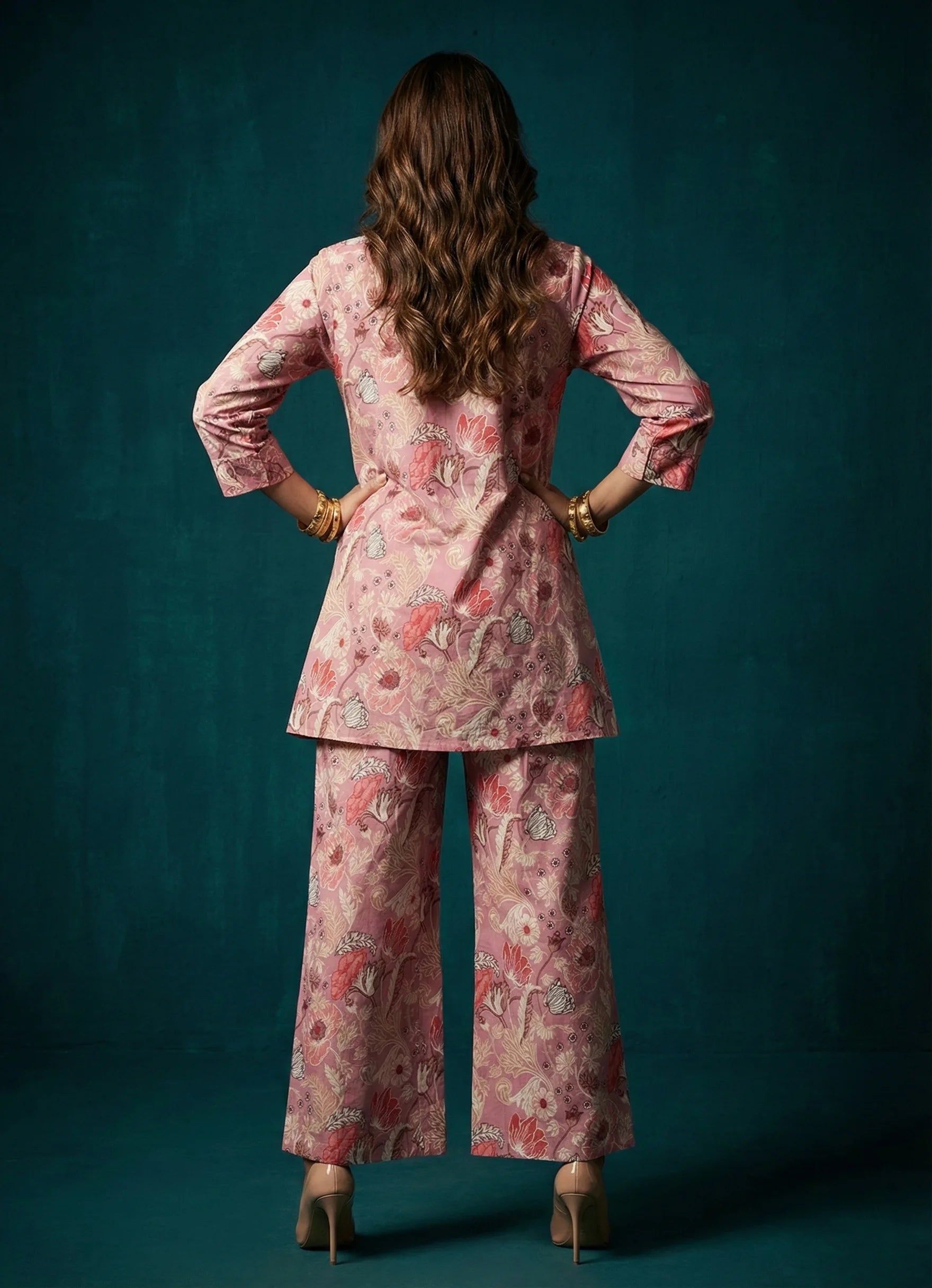 It is paired with a matching full-length palazzo pant for a coordinated silhouette.