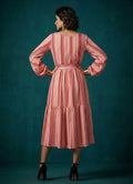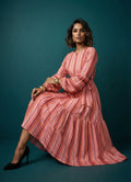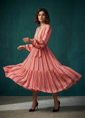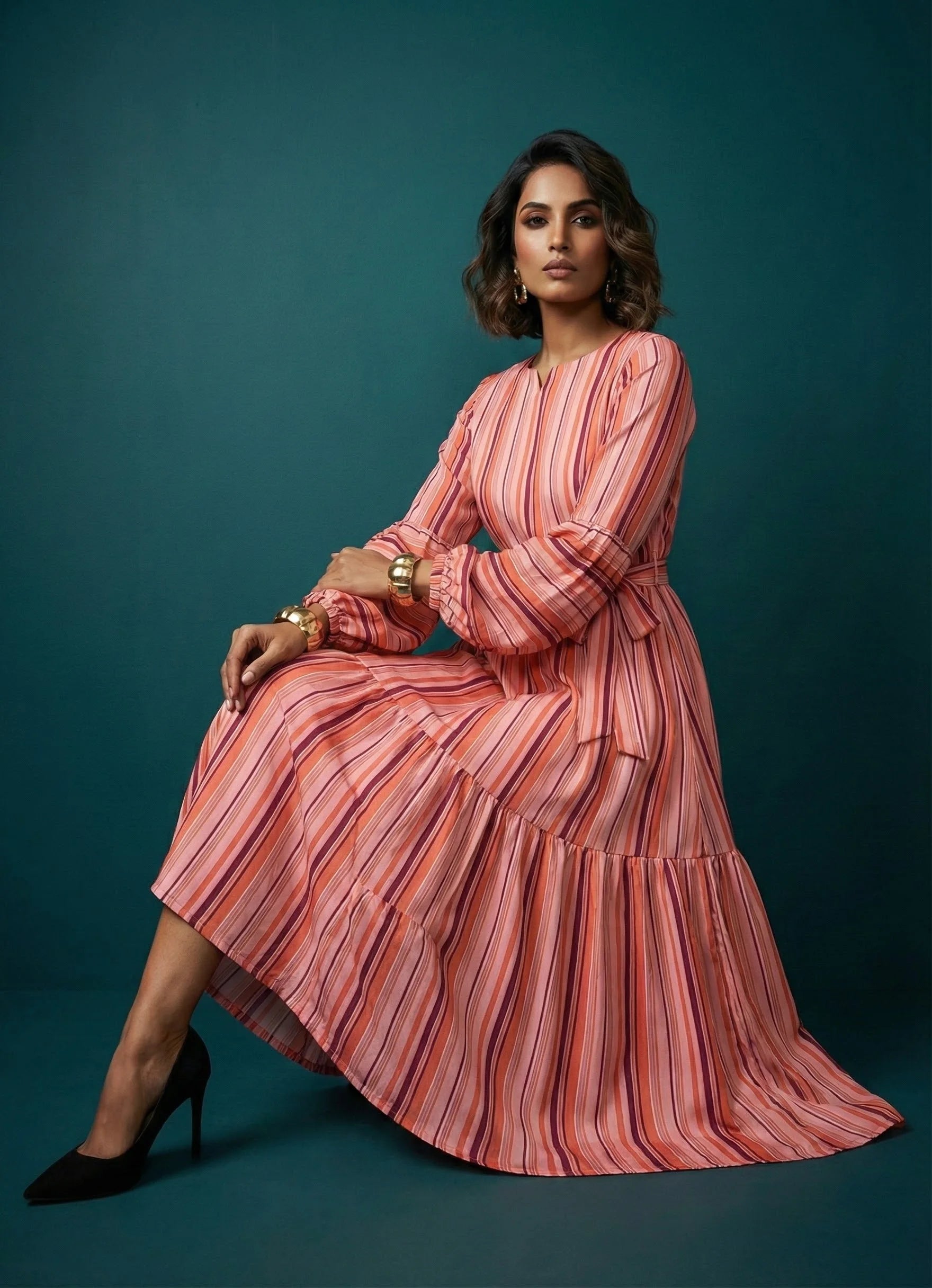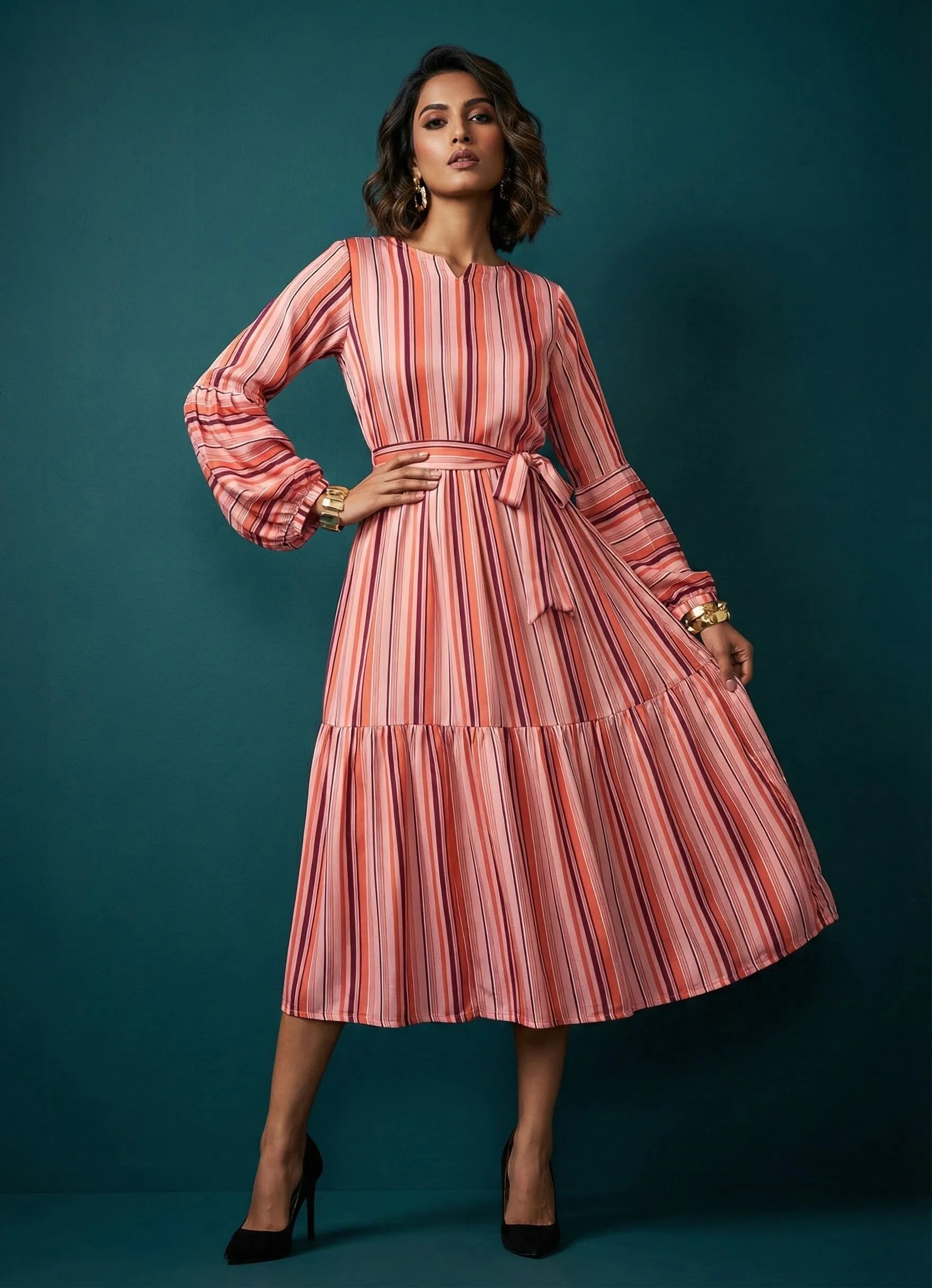 Be it an office meeting or be it a casual date, this peach shaded strip dress is beautiful.