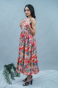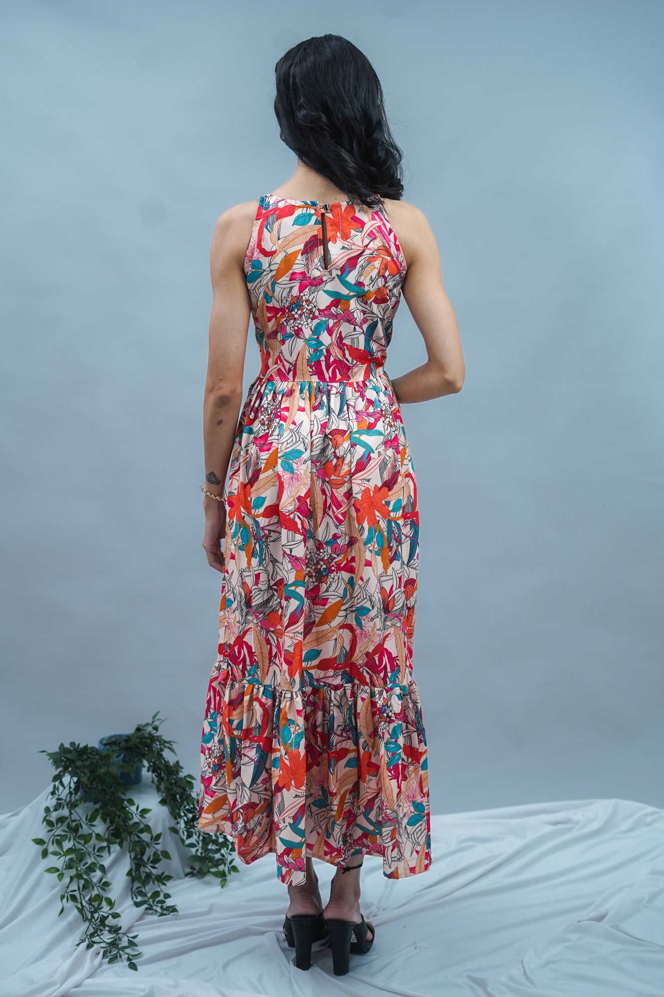 The sleeveless design, complemented by a chic halter neck, adds a touch of contemporary charm, making it a standout piece in any wardrobe. Featuring a captivating floral forest print, this single-piece dress is ideal for effortlessly stylish looks.