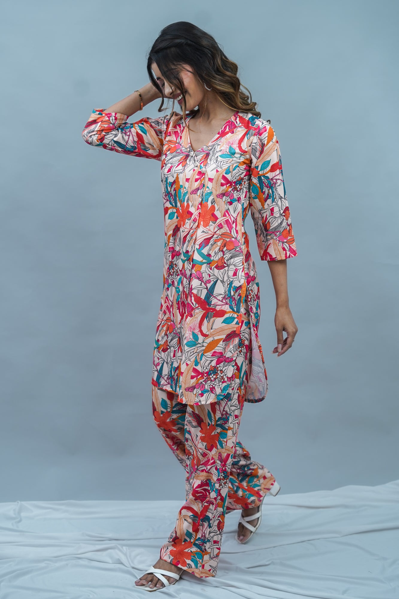 Elevate your everyday style with this dusty peach floral forest print kurti set, perfect for both casual and occasional wear.