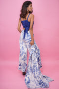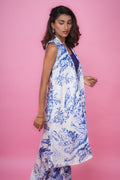 Step into elegance with this ivory peacock print co-ord set, ideal for both office and occasional wear. The set features a below-knee sleeveless jacket with intricate peacock print, adding a touch of exotic flair. Underneath, a blue inner with a round neck provides a complementary contrast to the jacket.