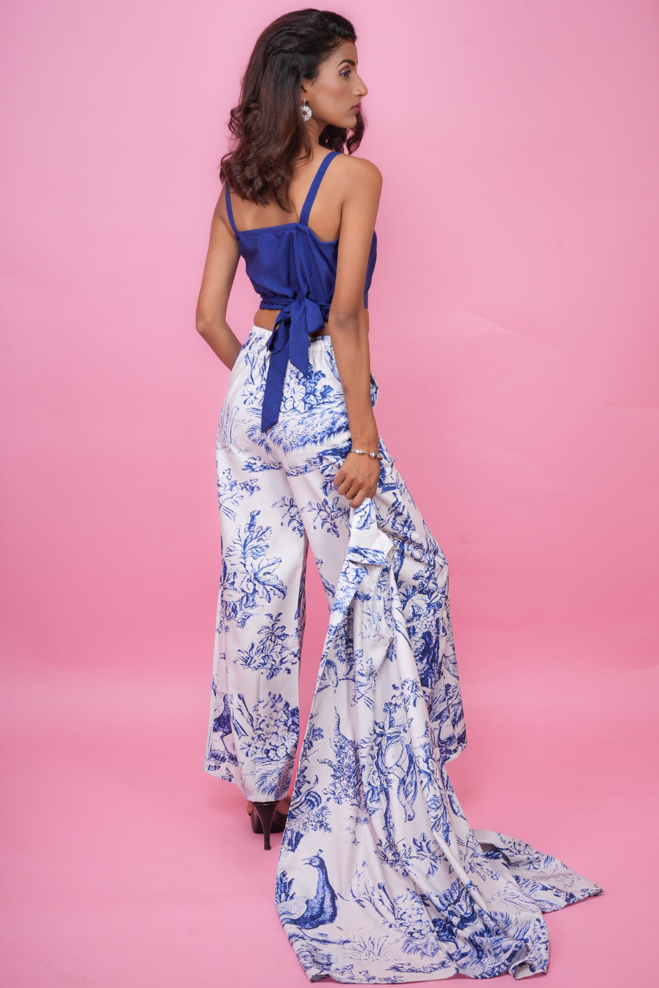 The full-length ivory pants are also adorned with the same peacock print, designed with a half-belt, half-elastic waistband for comfort. This set seamlessly blends style and sophistication, perfect for a polished, coordinated look.