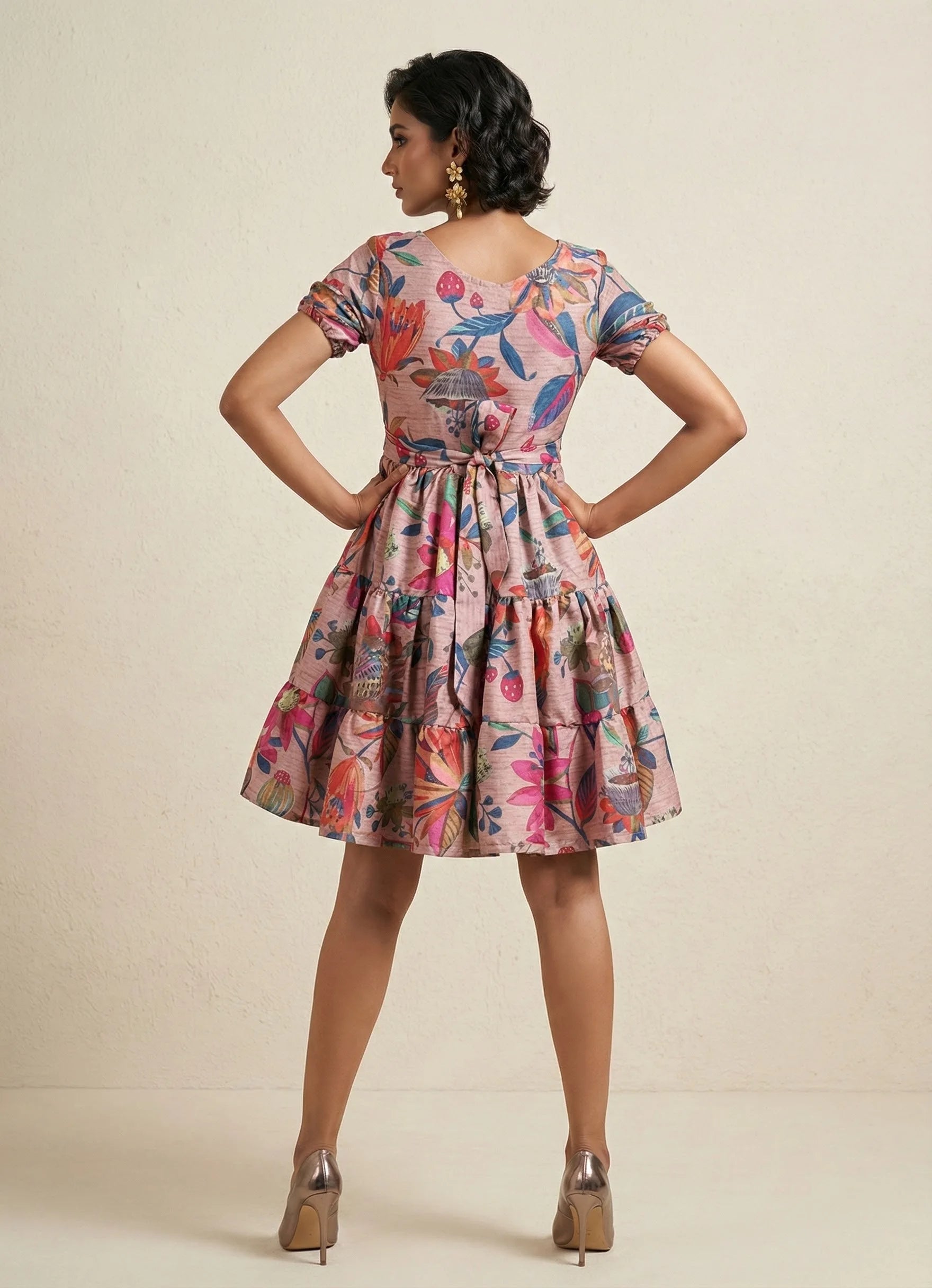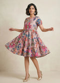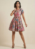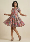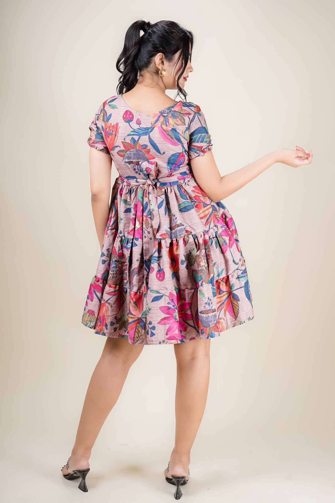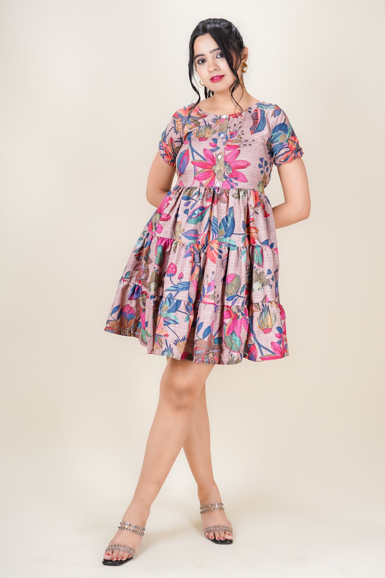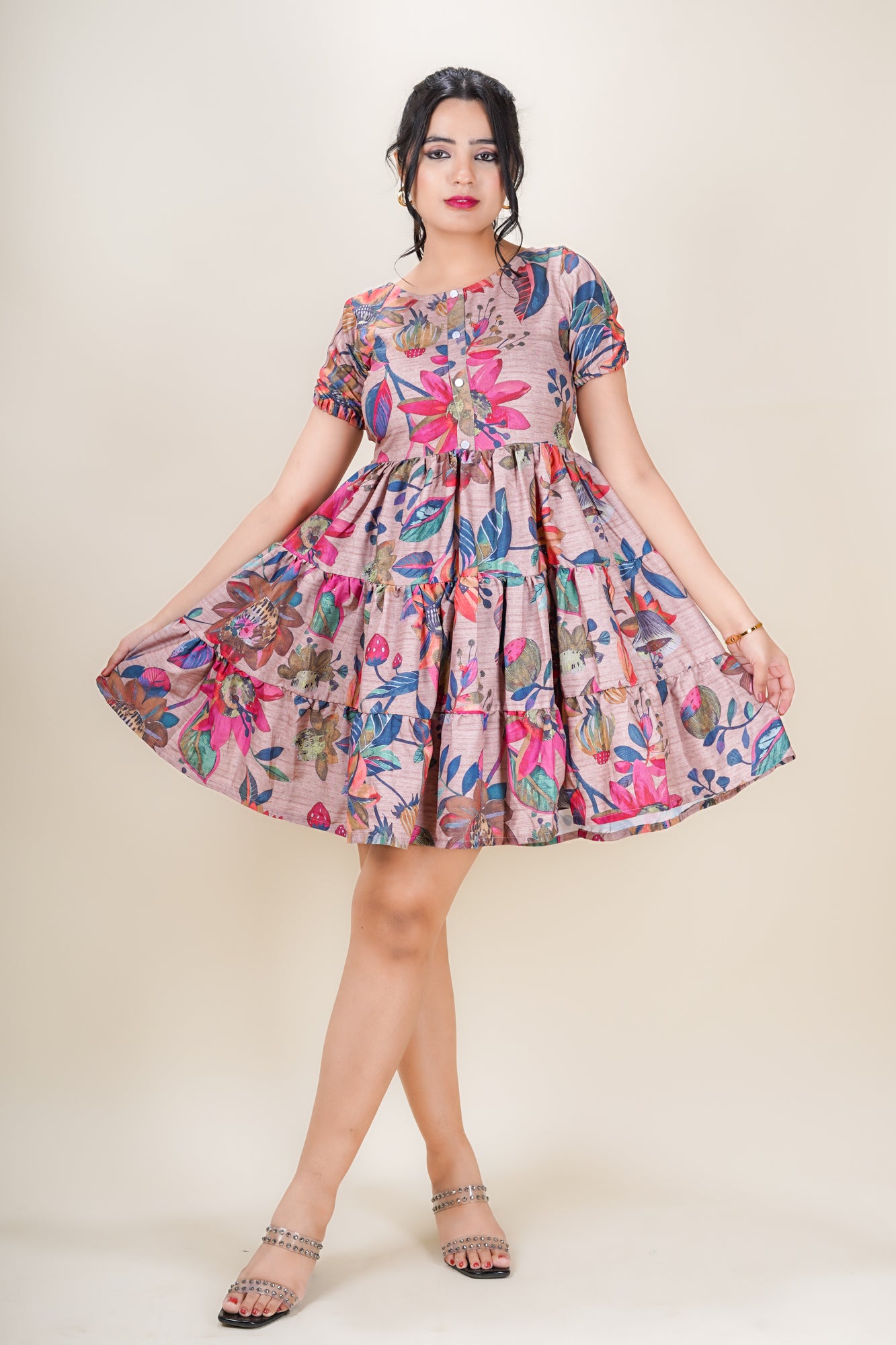 Chic and charming, this one-piece dress in elegant pearl khaki features a soft floral print and short sleeves. The round neck adds a classic touch, while the playful three-layer gathered design creates a flouncy, feminine silhouette. Crafted from Cotton Blend, it ensures comfort and easy care with gentle machine wash. Ideal for both occasional and regular outings, this above knee-length dress blends style and ease effortlessly.