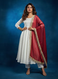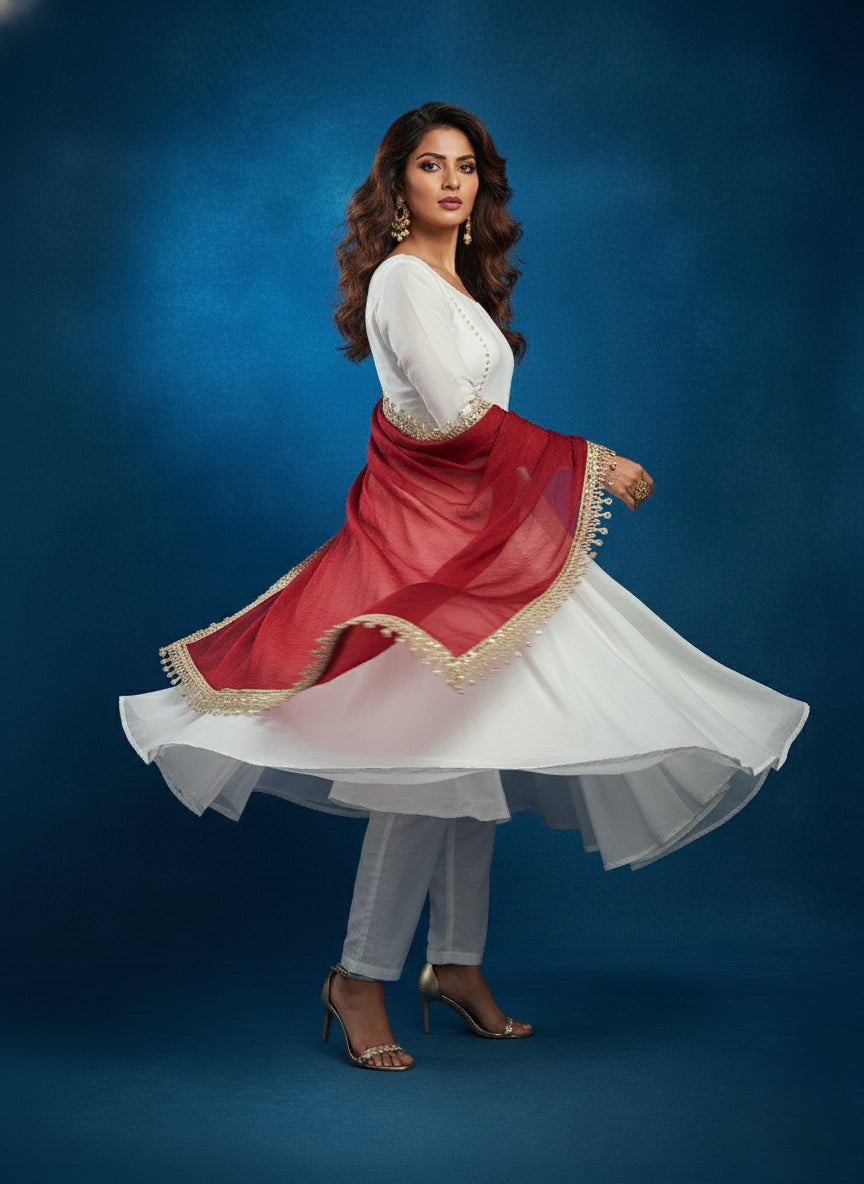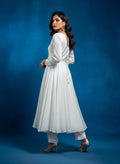 A graceful pearl white Anarkali set exuding timeless elegance. Crafted with soft fandy fabric for a luxurious festive appeal. Features a simple round neck and full sleeves for a classic look. Paired with matching narrow pants for refined sophistication. Accentuated by a mirror lace dupatta with a heavy border for added glamour.