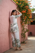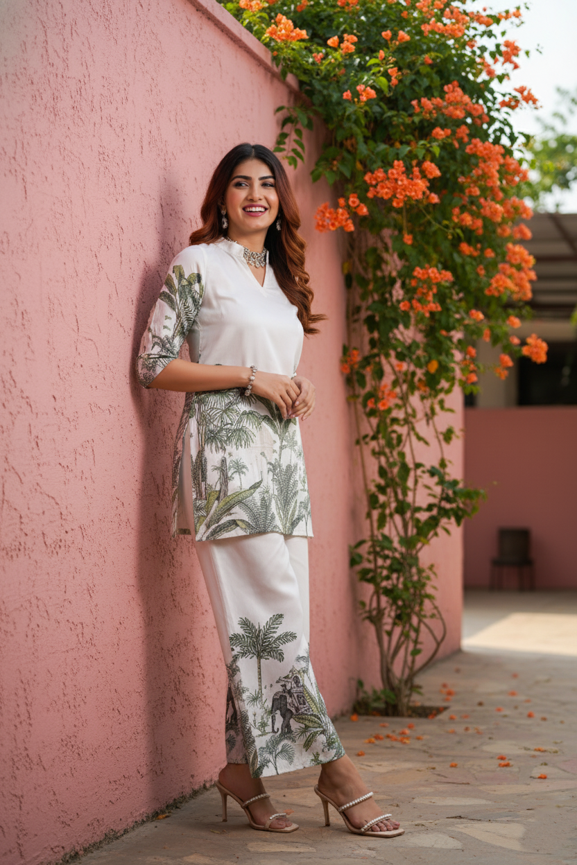 This elegant set showcases a pearl white kurti featuring ¾ sleeves and a sophisticated collar V-neck design. Adorned with a delicate royal garden placement print, the kurti has a flattering thigh-length silhouette crafted from soft Cotton blend fabric for comfort and easy maintenance with gentle machine wash. Complementing the top are matching pearl white palazzo pants with the same royal garden print, full length, and a half belt half elastic closure for a comfortable fit. Perfect for both occasional and regular wear, this set combines timeless style with graceful comfort.