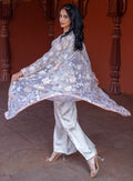 Introducing "Silhouette," an enchanting ensemble tailored for festive occasions. This bright white outfit exudes elegance with its full-sleeved top made of luxurious silk fabric, featuring a plain sleeve style and a square neck. Paired with a full-length silk palazzo pant and complemented by a Georgette shrug, this ensemble epitomizes sophistication and charm, making it the perfect choice for any celebration.