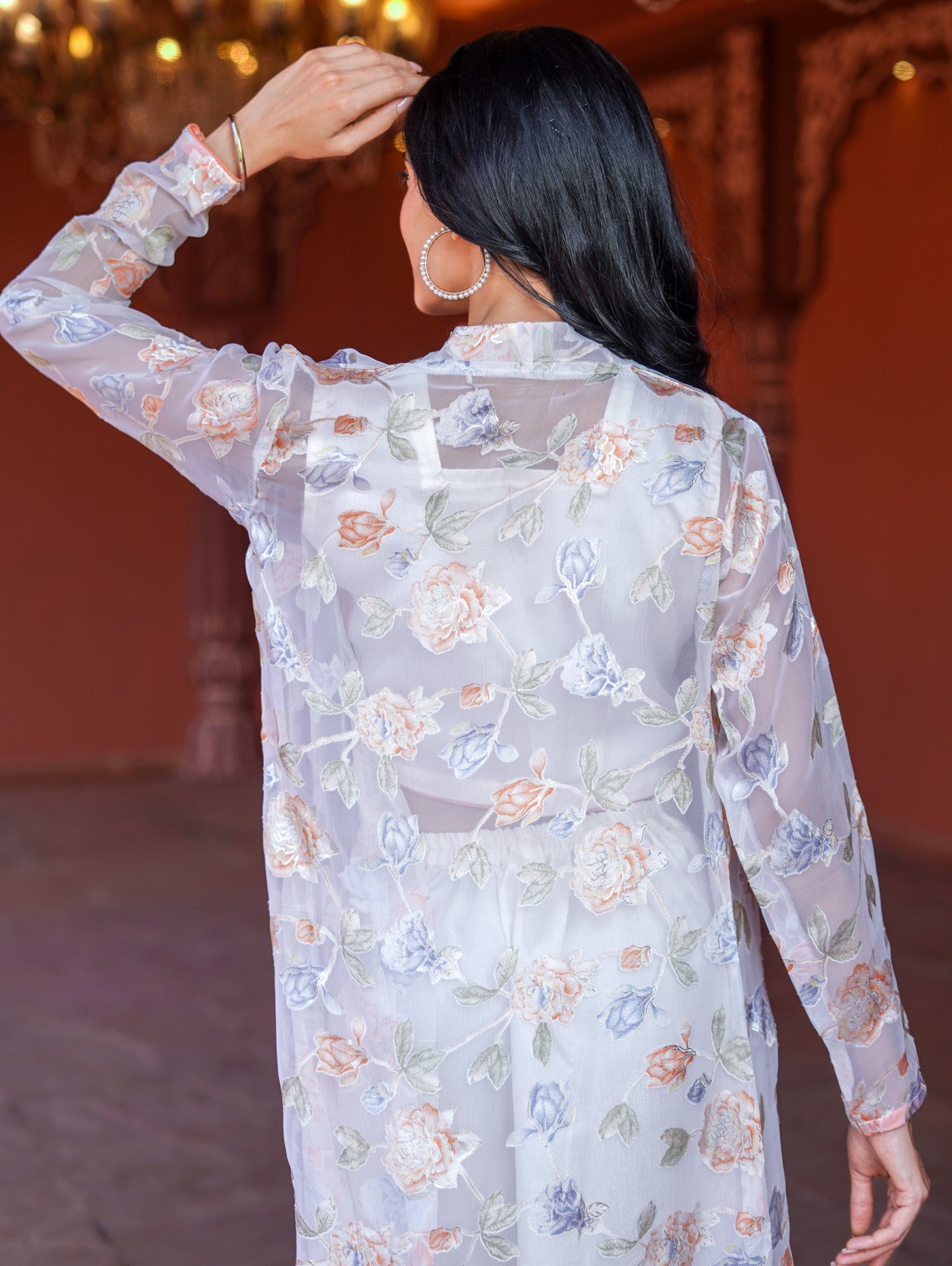 Silhouette: Pearl white georgette shrug with palazzo & sleeveless top
