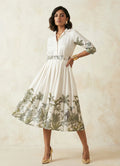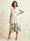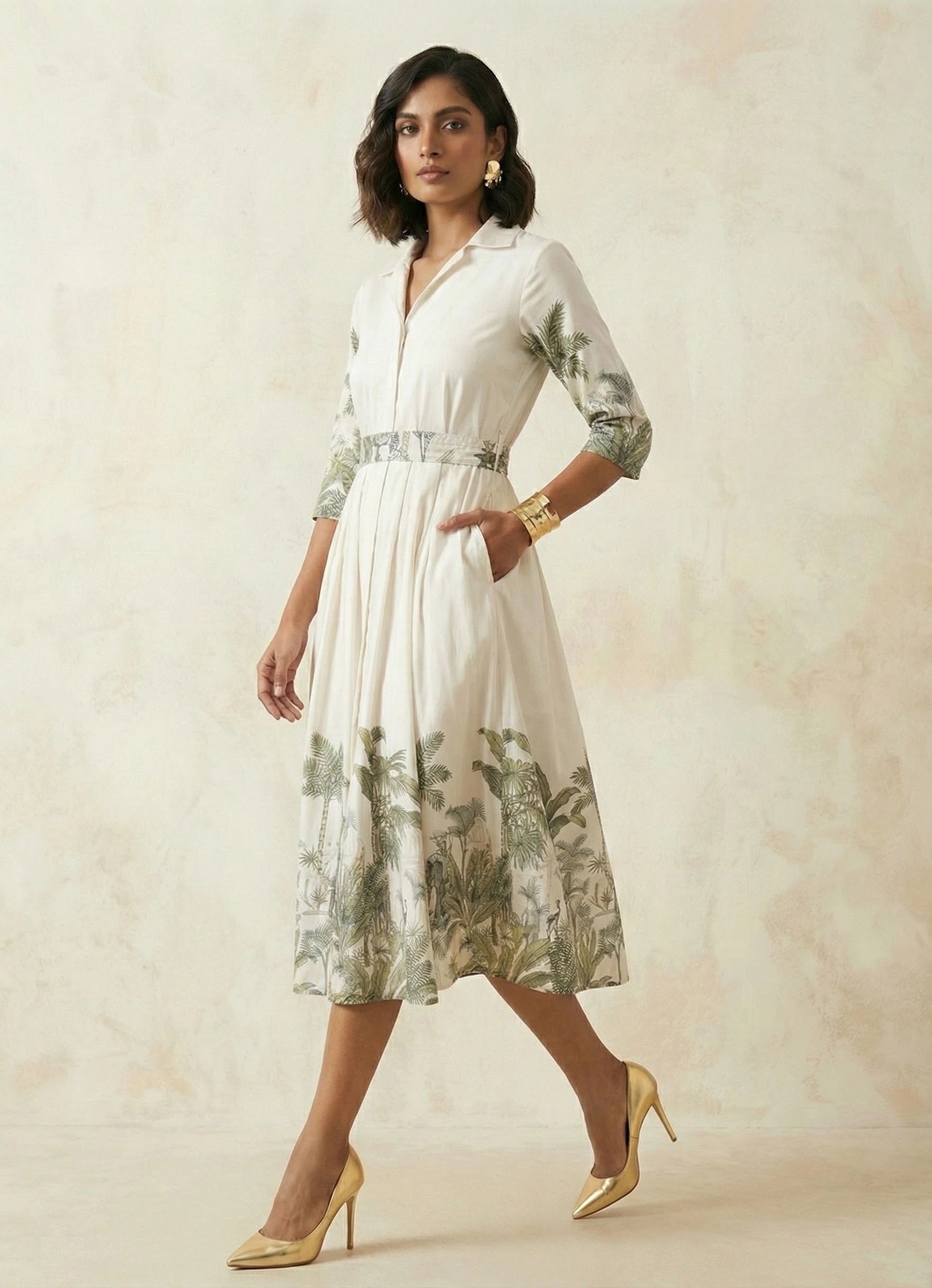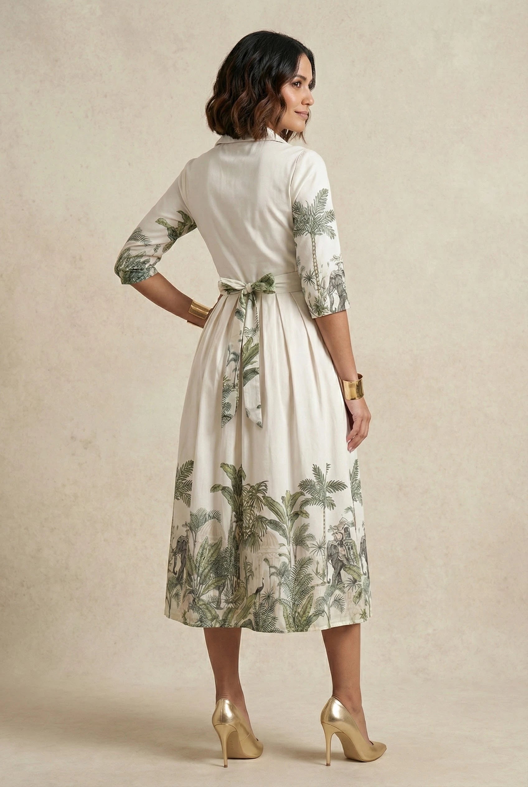 This elegant pearl white dress features ¾ plain sleeves and a classic collar neck, adorned with a sophisticated royal jungle placement print. Designed as a box pleat one-piece dress with a belt, it falls below the knee for a flattering silhouette. Crafted from Cotton Blend with digital print, it ensures comfort and easy care with gentle machine wash. Perfect for both occasional and regular wear, this dress combines timeless style with effortless grace.