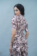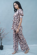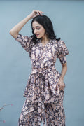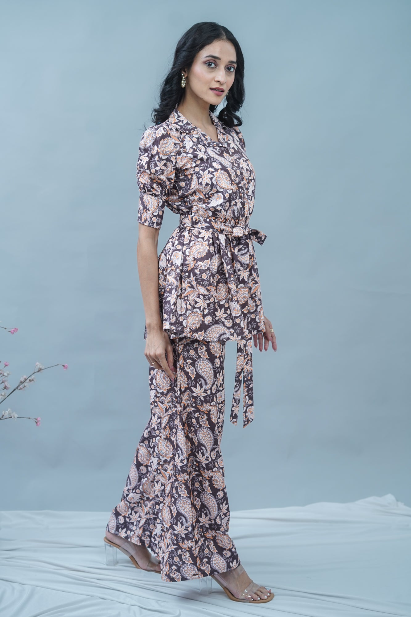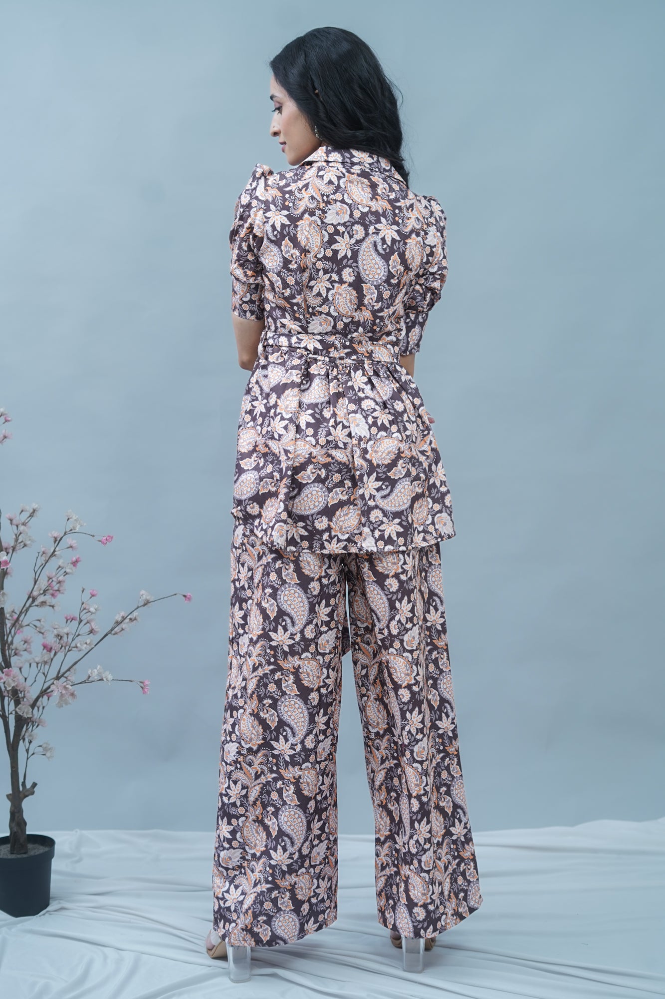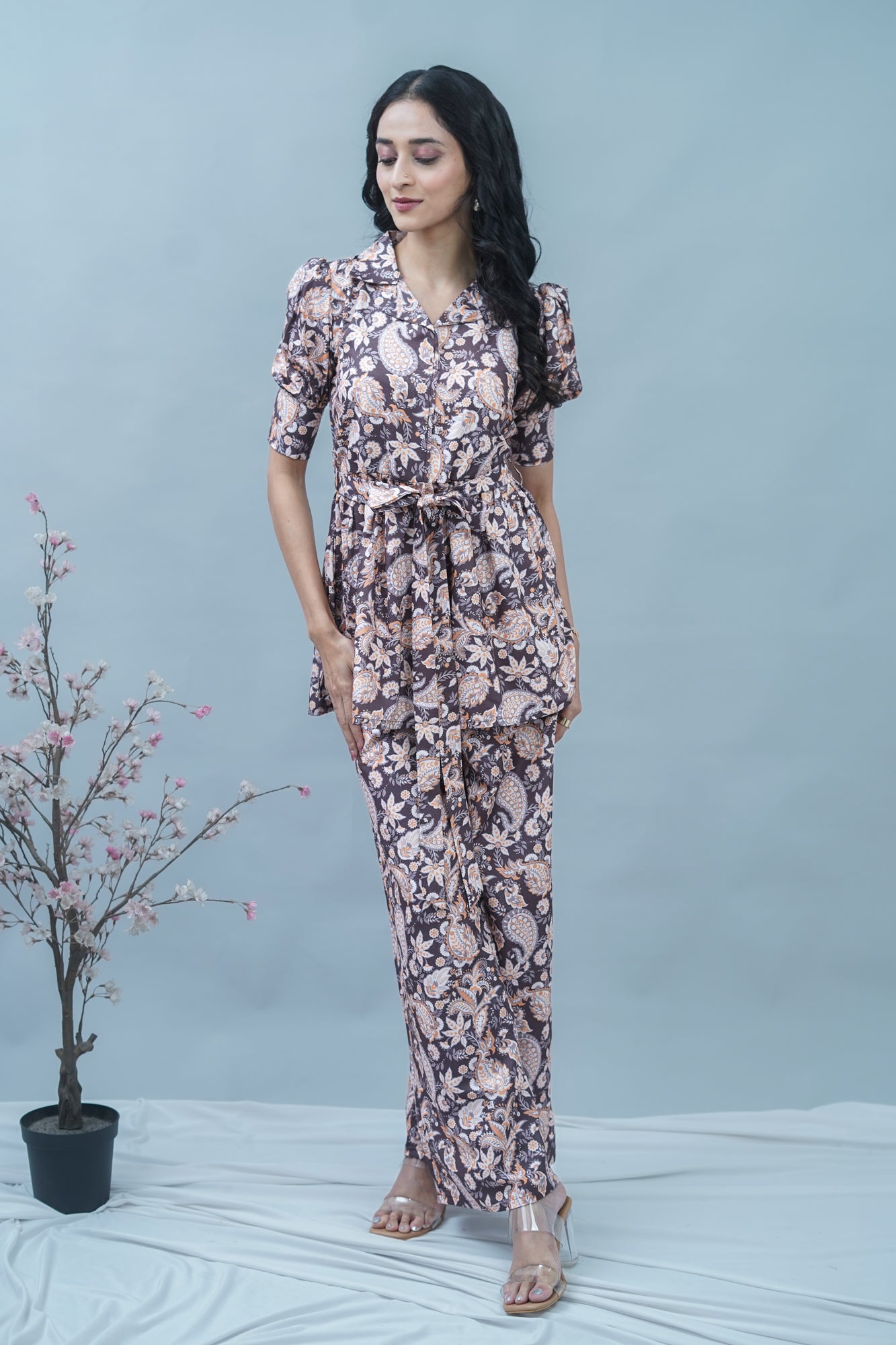 Upgrade your wardrobe with this chocolate brown floral paisley peplum co-ord set, ideal for casual and occasional wear. The peplum crop top features a stylish collar neck, puff elbow sleeves, and a graceful floral paisley print, adding elegance to your look.