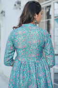 Pretty pink floral print on Persian green Cotton Blend fabric gives a perfect royal festive look, addition of a golden shimmer lace on front yoke with magenta pink piping, three-fourth sleeves, below hip length,gathered hemline, side slits and collared neckline is what you need this festival.