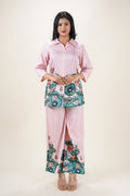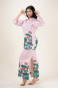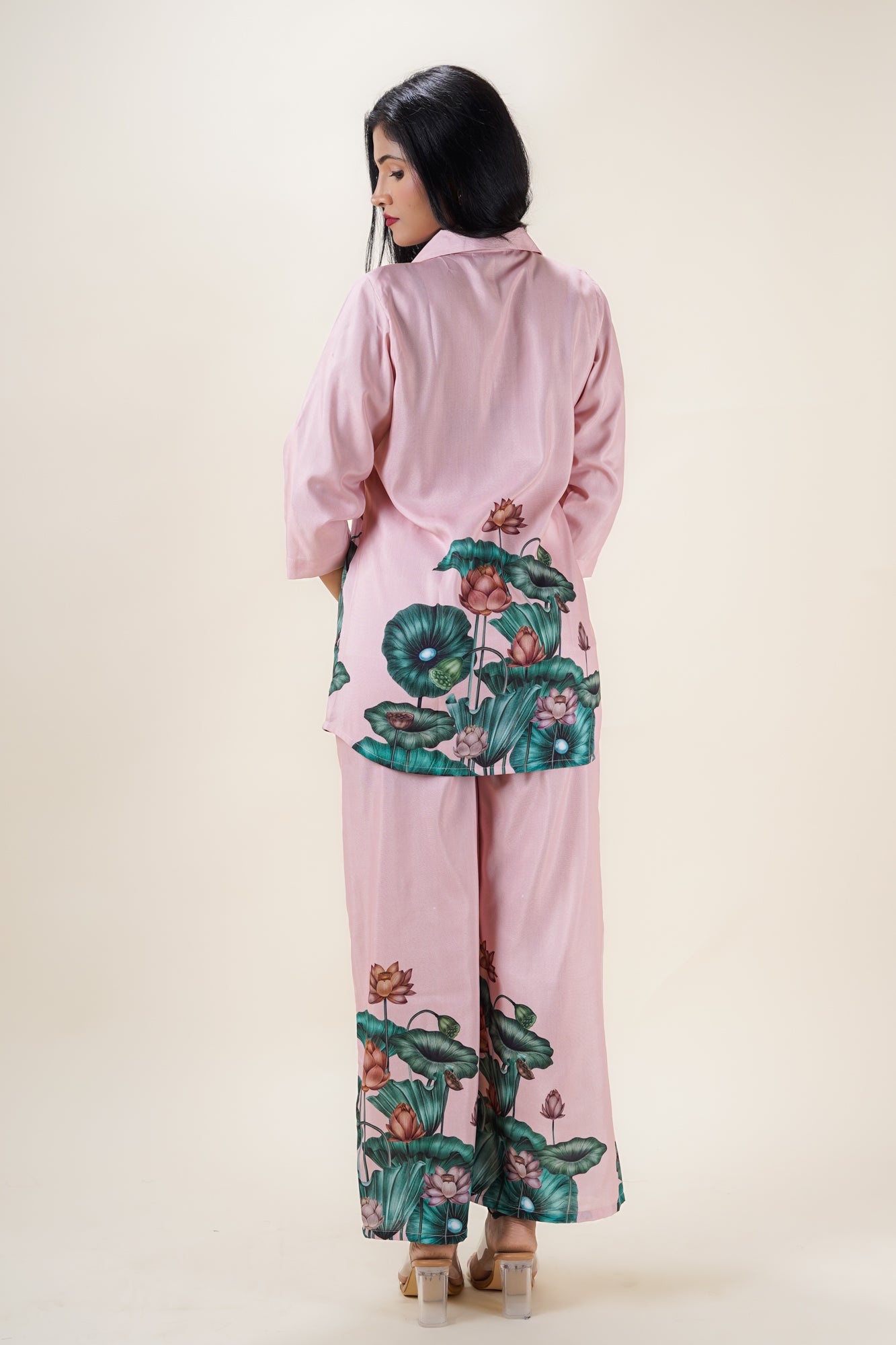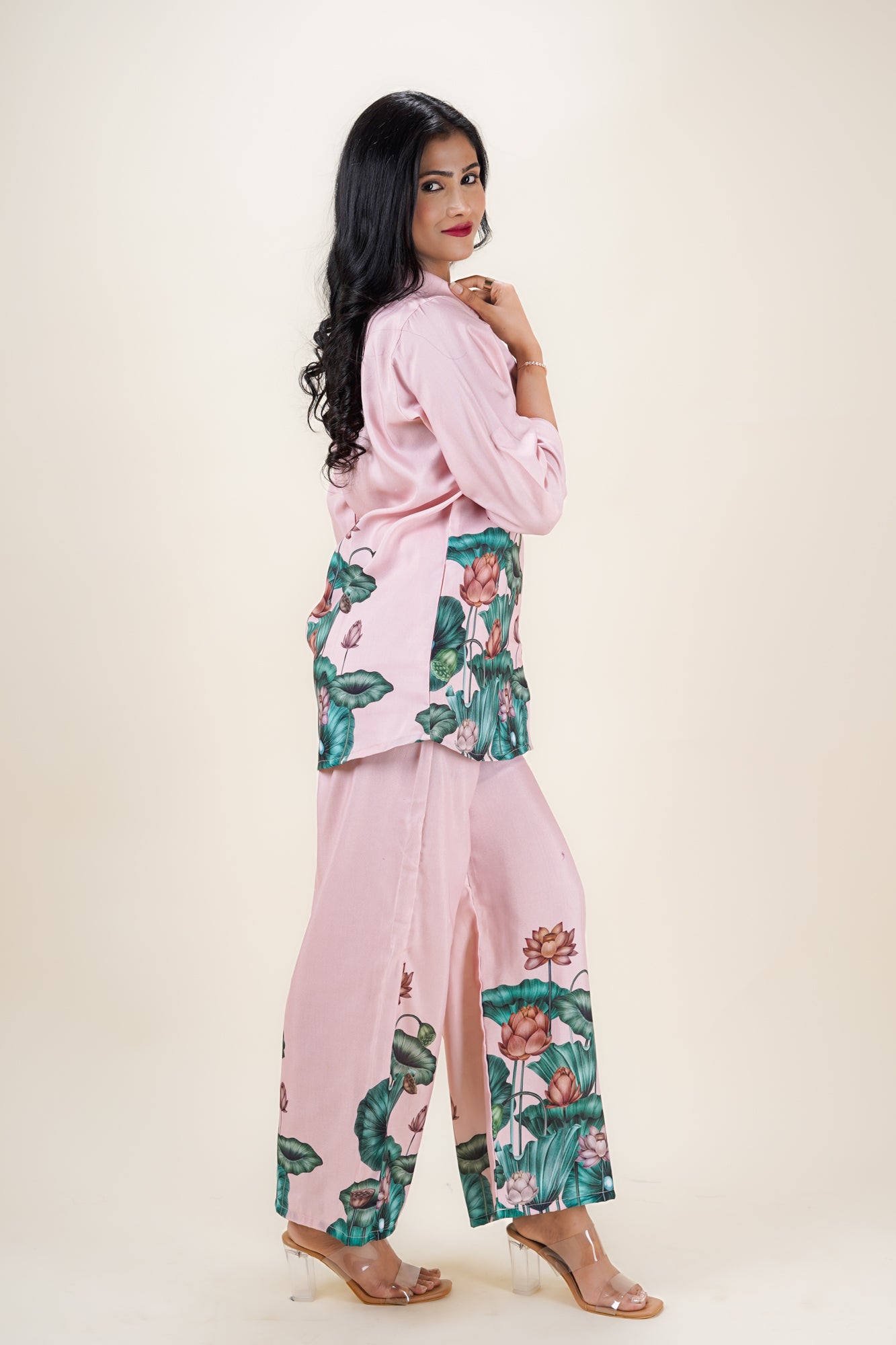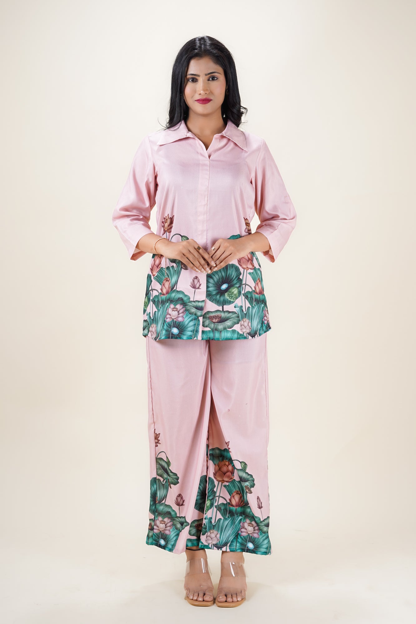 This charming set features a pestel pink kurti with elegant ¾ sleeves and a classic collar neck, adorned with a delicate lotus placement print. The kurti falls to a comfortable hip length, crafted from soft Cotton blend fabric that ensures easy care with gentle machine washing. Paired with matching pestel pink palazzo pants featuring the same lotus print, full length, and a convenient half belt half elastic closure for a perfect fit. Ideal for both occasional and regular wear, this ensemble offers a graceful and comfortable look for any occasion.