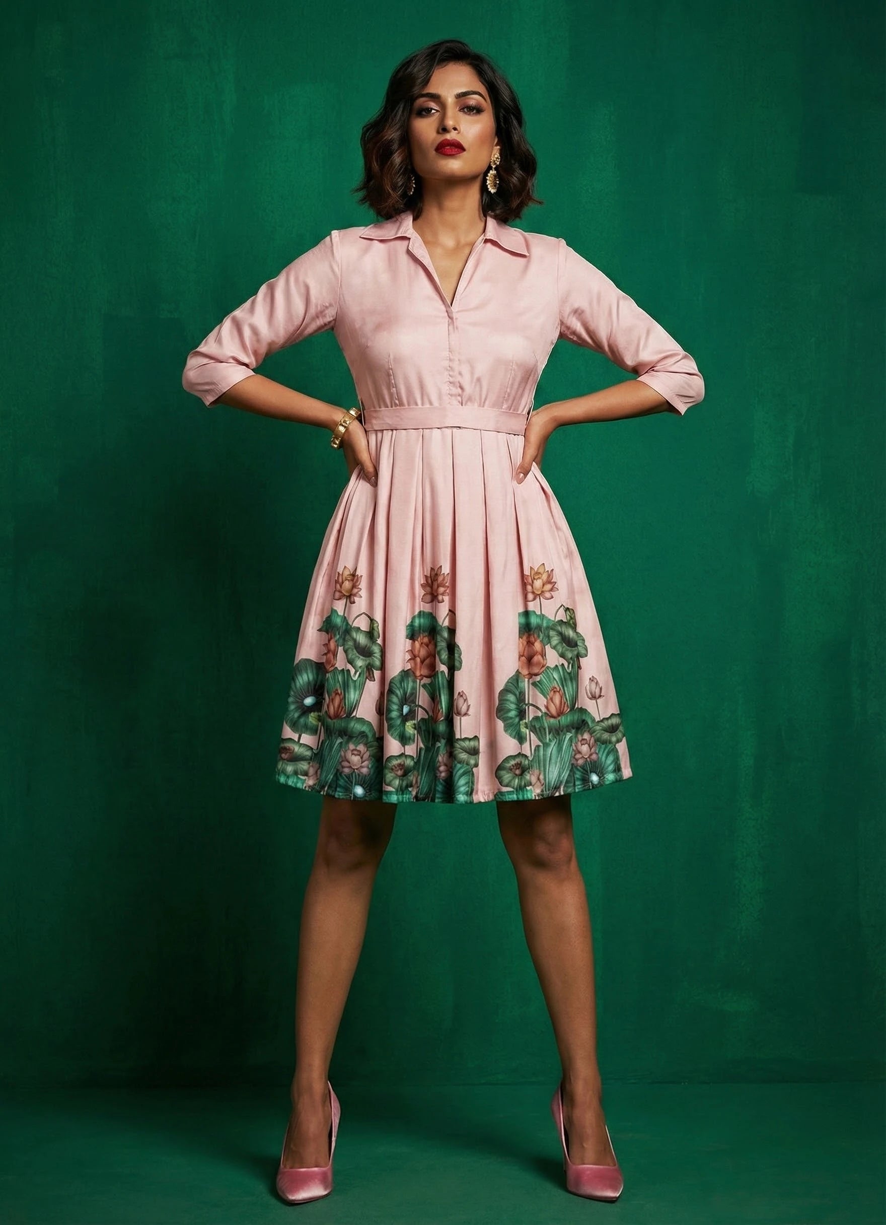 This elegant pestle pink sleeveless dress features a classic collar neck and a flattering box pleat design that adds graceful volume and movement. Made from Cotton Blend with a delicate lotus placement print, the dress is both stylish and comfortable, finished with gentle machine wash care. With an above knee length, it’s perfect for both occasional and regular wear, offering a chic yet effortless look for any event.