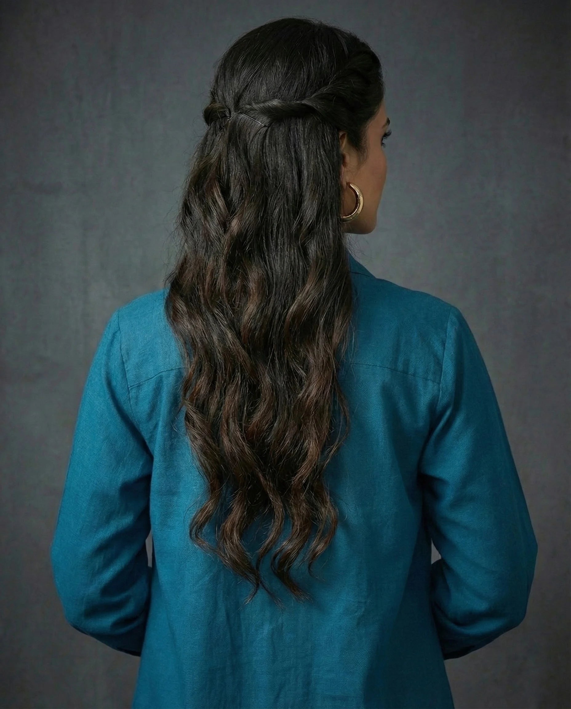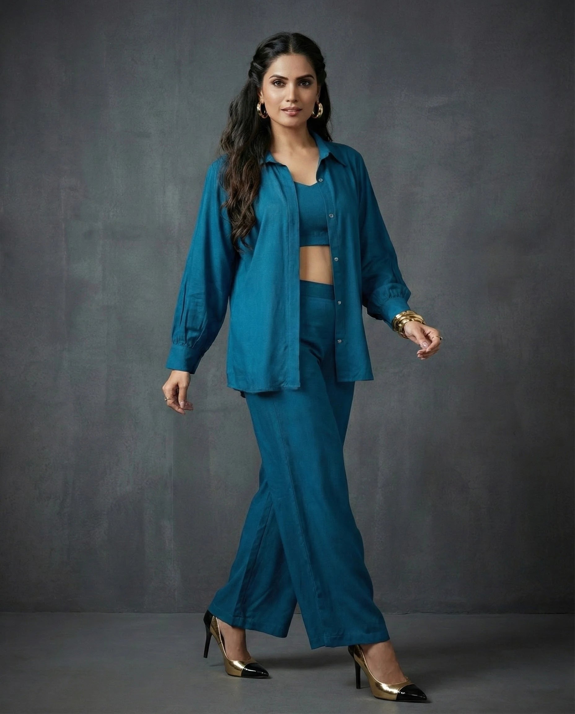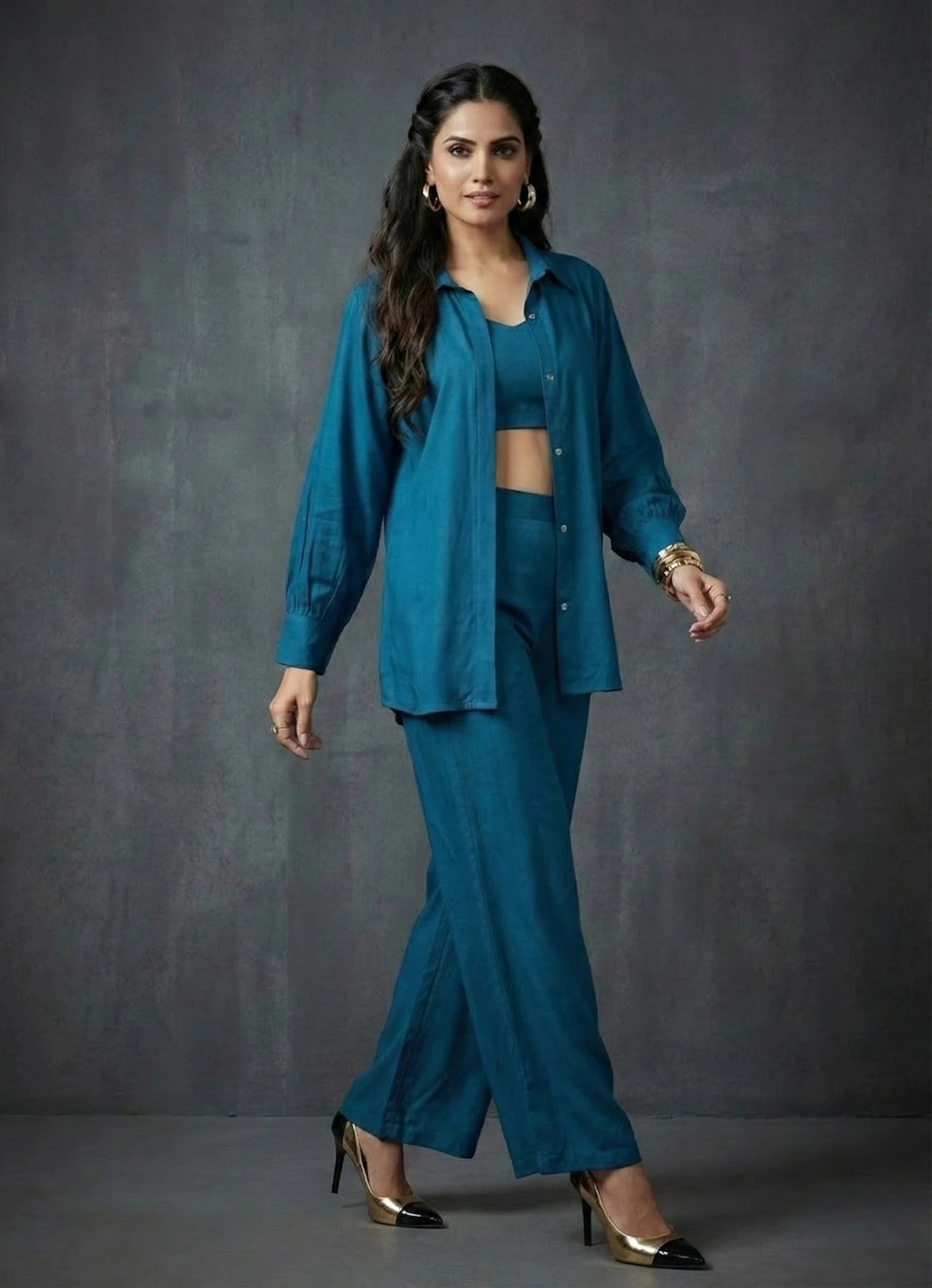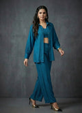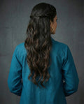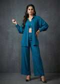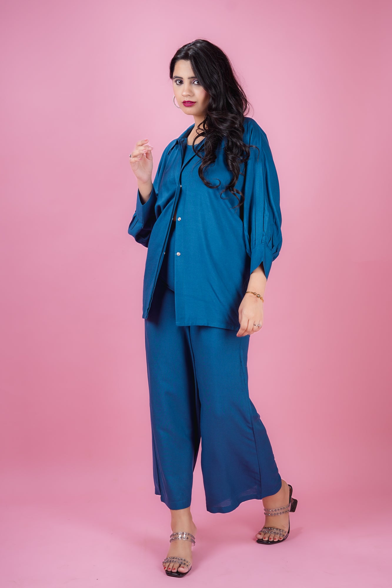 Make a subtle statement with this elegant petrol blue co-ord set, perfect for both occasional and everyday wear. The ensemble features a waist-length kaftan-style top with full sleeves and a structured collar neck, layered over a comfortable round-neck inner in matching petrol blue. Crafted from soft Cotton blend fabric, it offers a fluid drape and breathable comfort, ideal for day-to-night transitions. Paired with opera mauve full-length palazzo pants, featuring a half belt and half elastic waistband, this solid-hued, no-print outfit combines sophistication with relaxed flair.