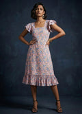 Bright and simple a anywhere go to option. Add this bright coloured floral printed outfit to your wardrobe crafted out of cotton fabric. This pattern consists of square neck, pleated sleeves, straight cut and frills on hemline.