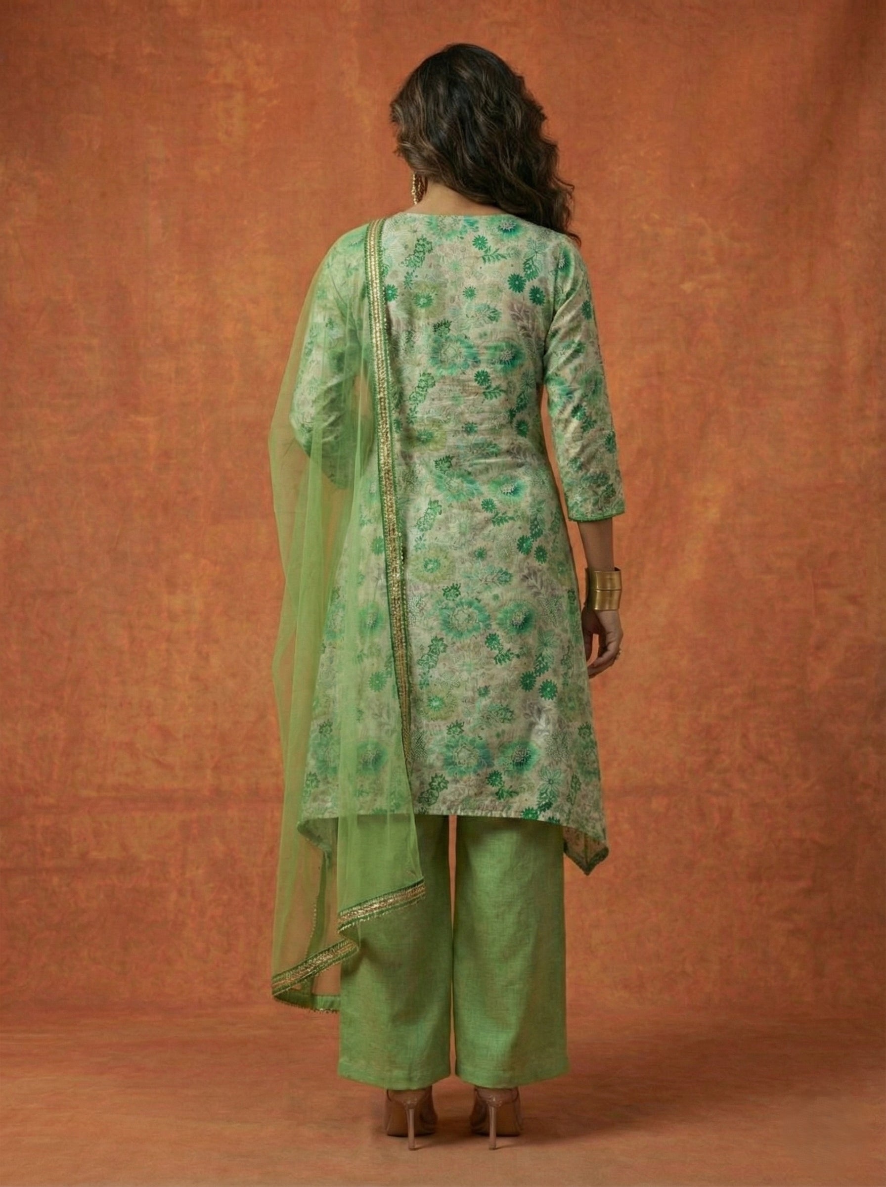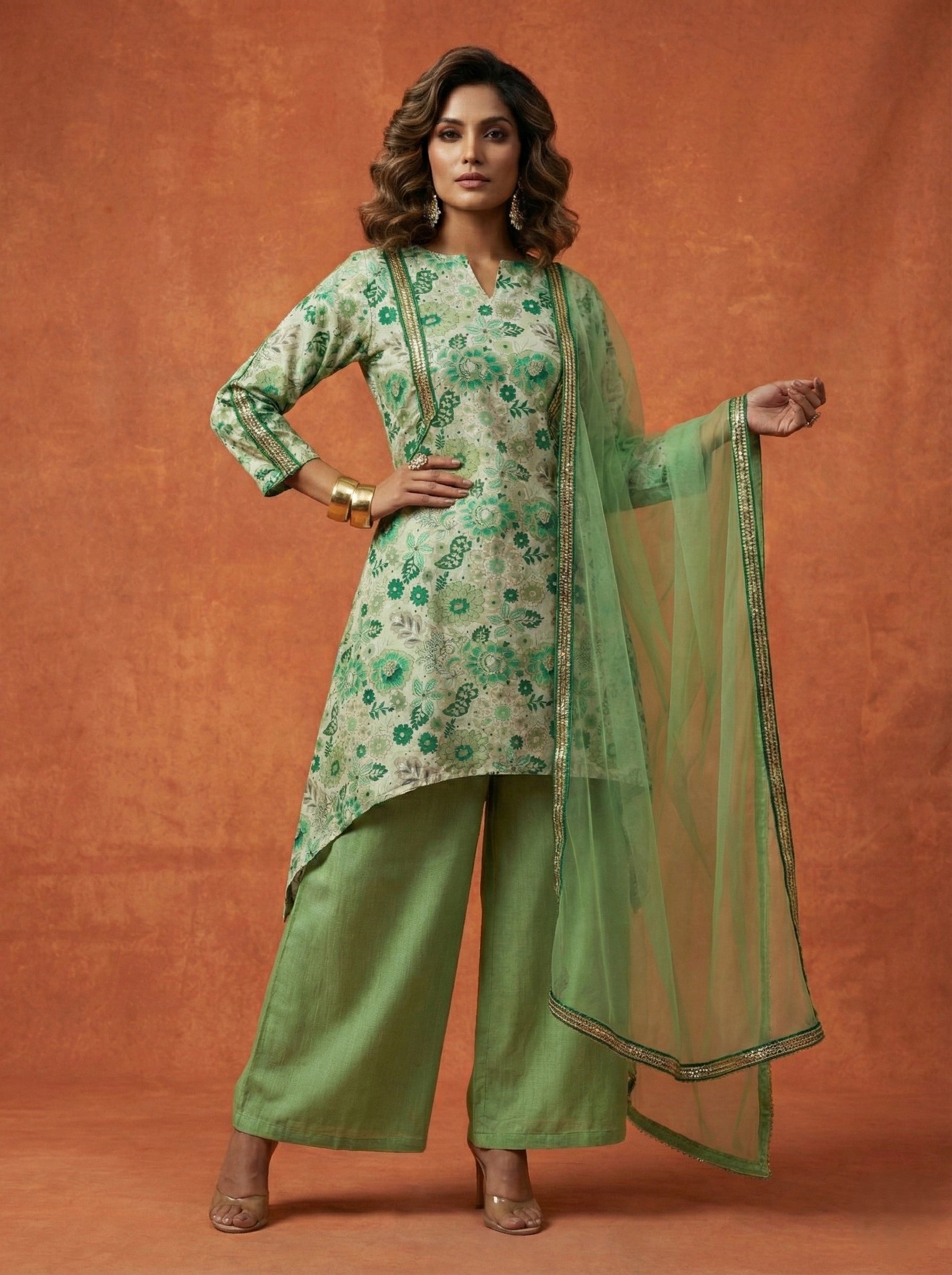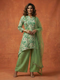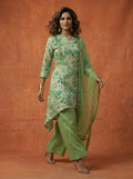 Pista Green Floral High-Low Kurti Set - 52725KS