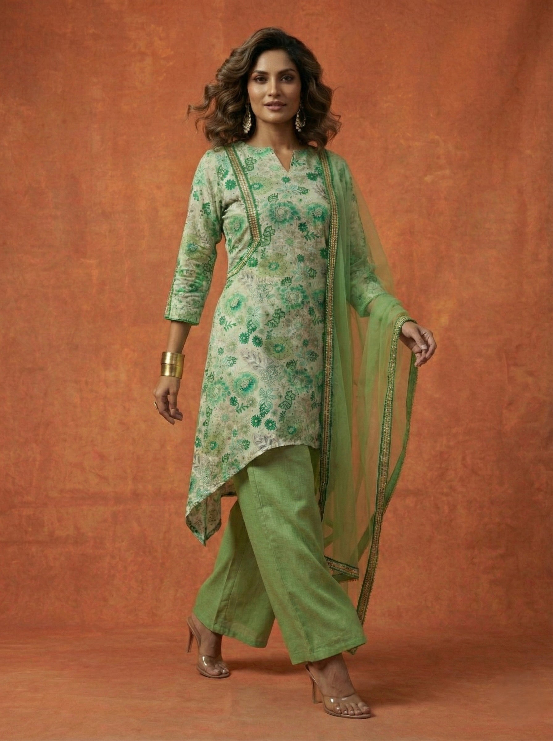 Crafted in soothing pista green, this elegant set features a graceful A-line high-low kurti. The round V-neckline and ¾ sleeves are adorned with lace detailing for a refined touch. Floral prints with highlight embroidery enhance its festive charm. It comes paired with a plain narrow pant in matching pista green.