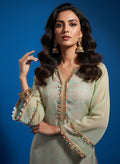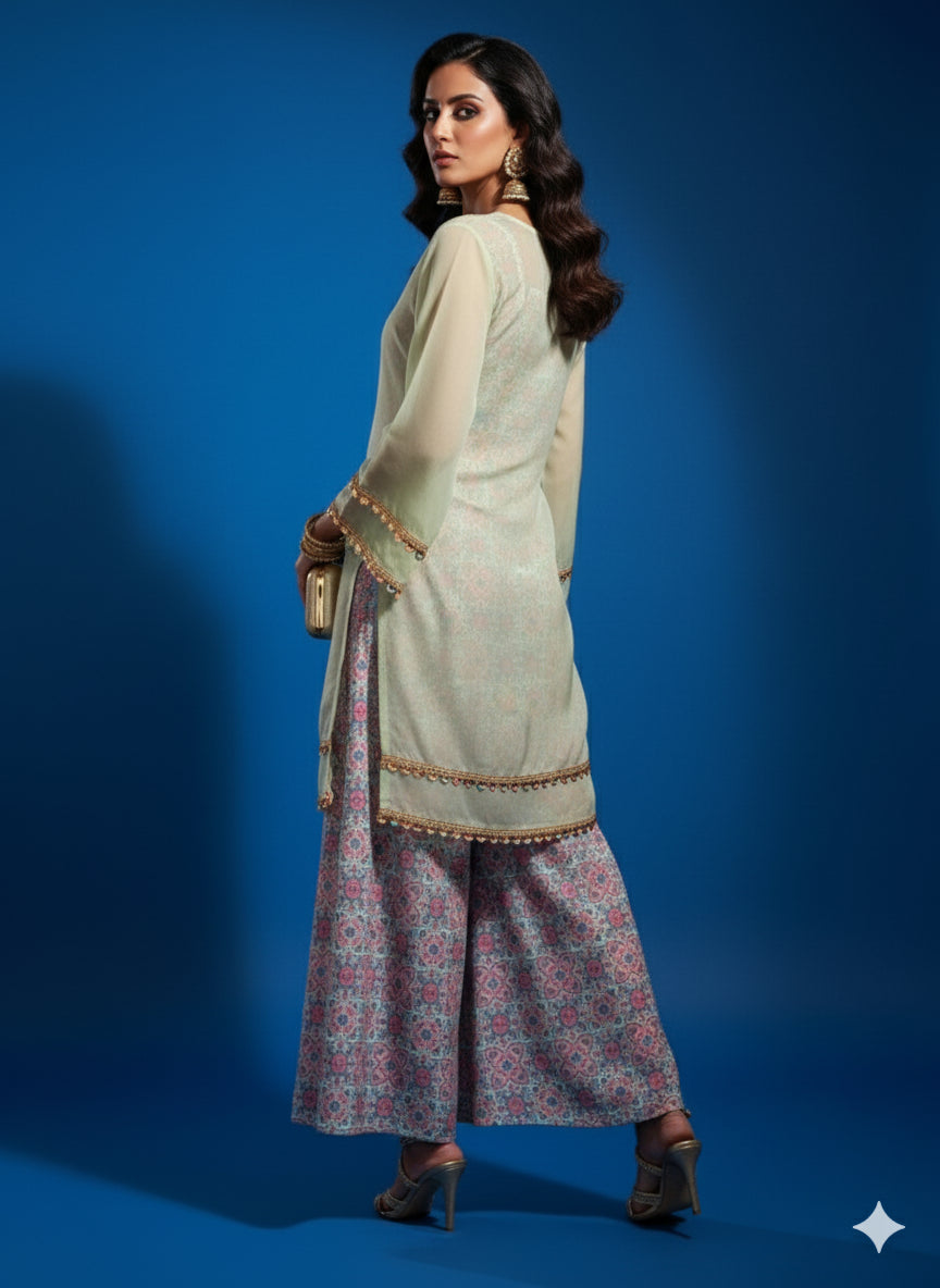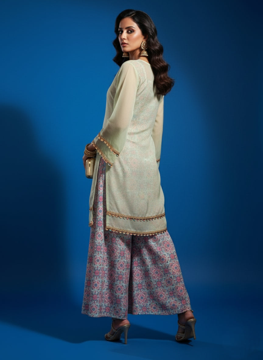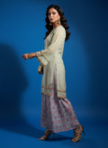 A refreshing pista green set featuring a knee-length flare kurti with full sleeves. Designed with a round neckline and subtle geometric prints for a modern appeal. Crafted in organza with a printed cotton blend inner for a lightweight, comfortable feel.