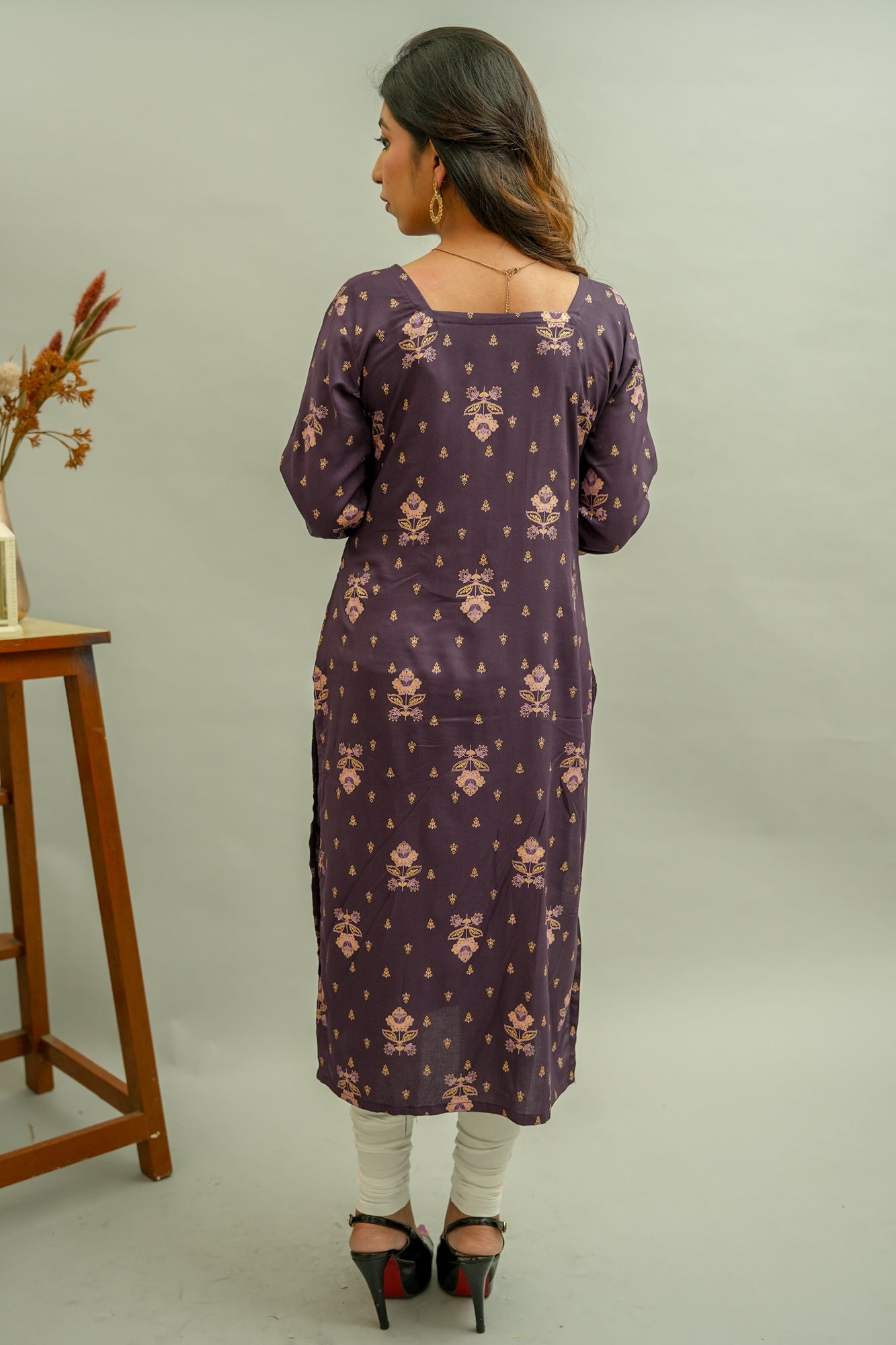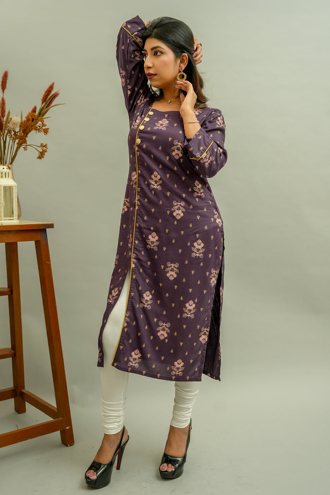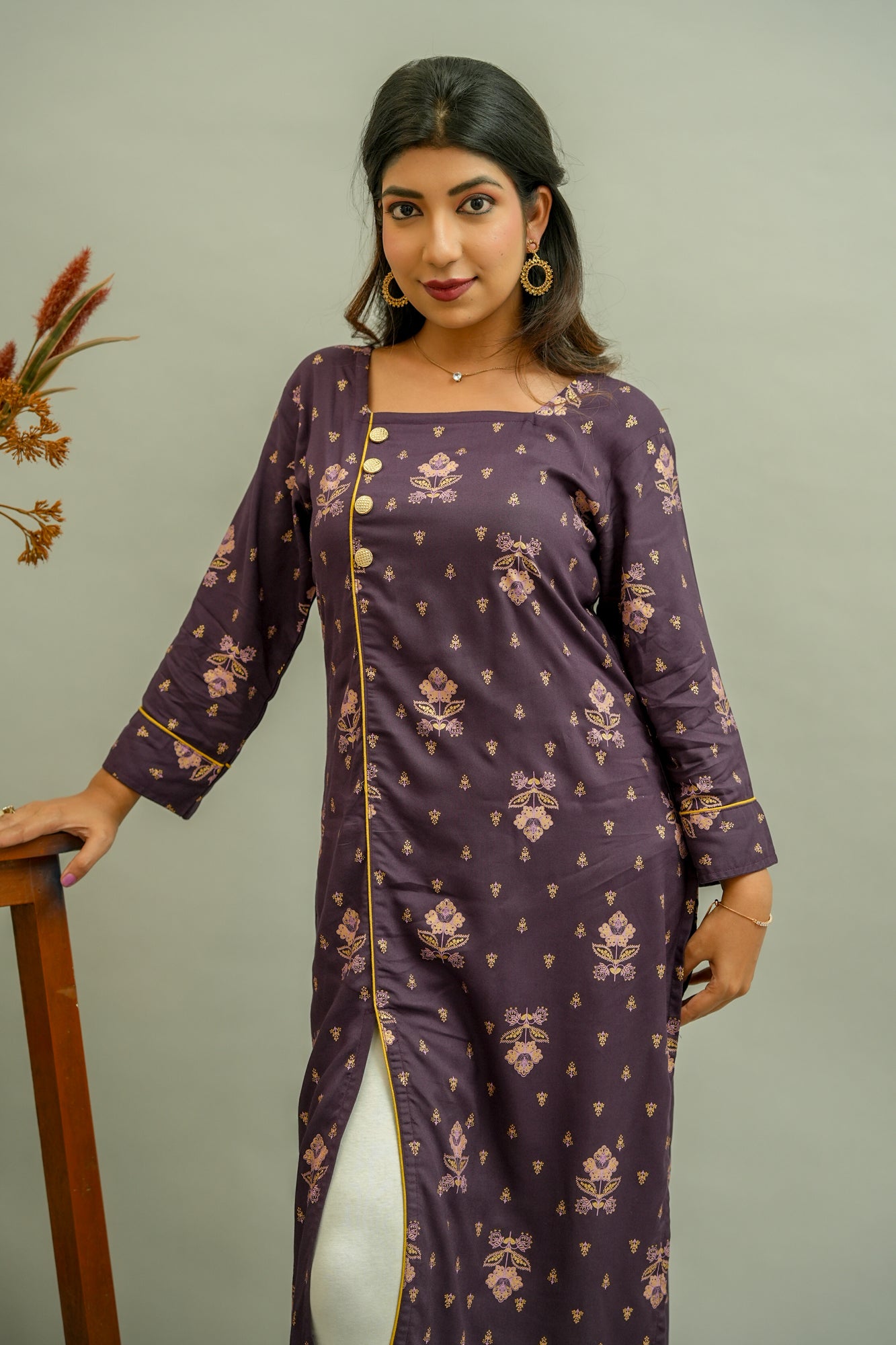 Description: A formal festive to fill in your wardrobe is here. This dark purple kurta patterned out from golden floral printed Cotton Blend fabric consists of square neck, straight cut and three-fourth sleeves with the embellishment of golden piping and buttons.