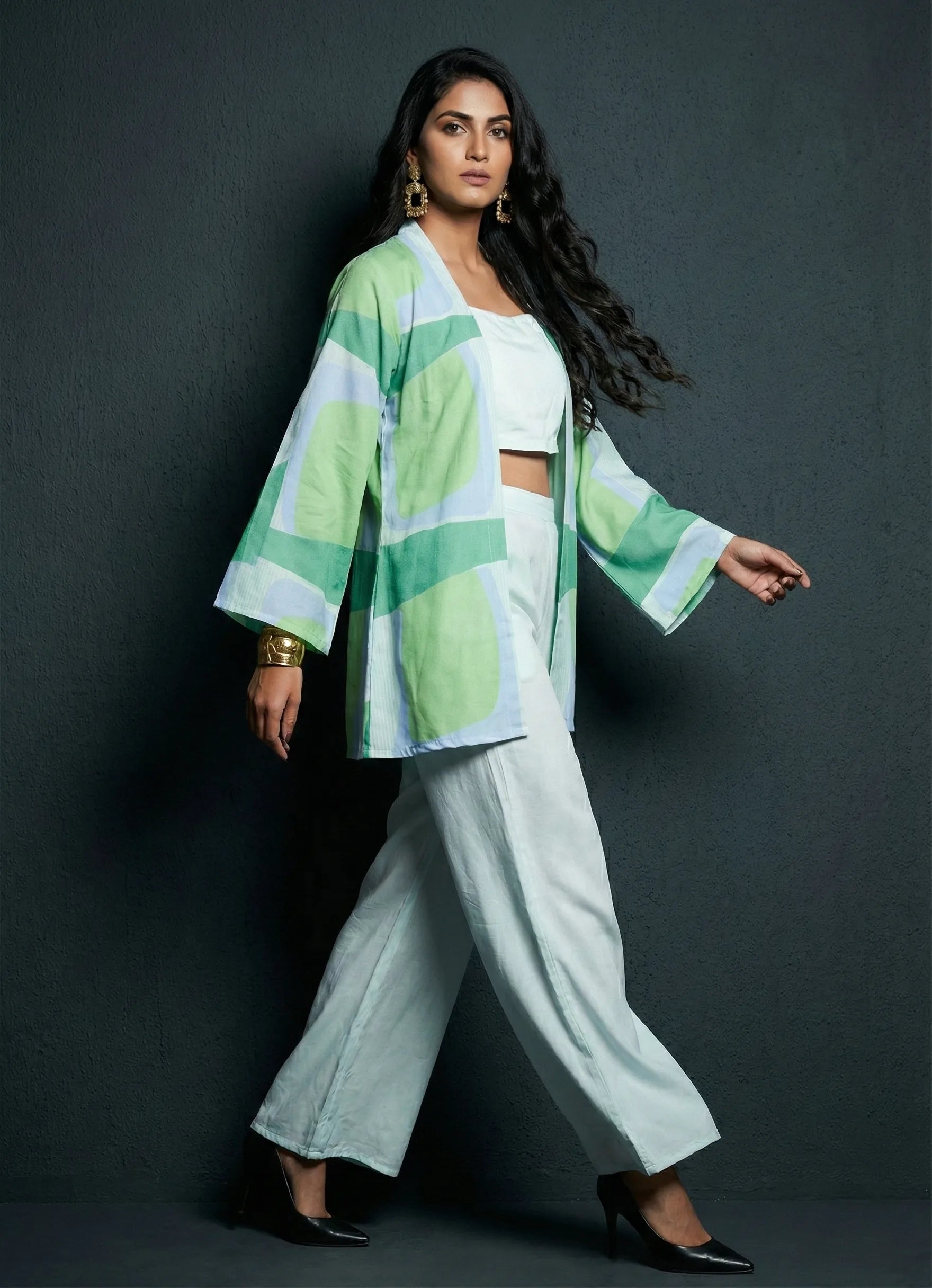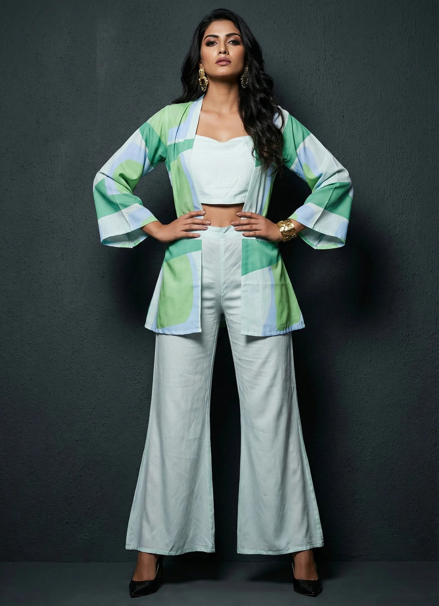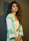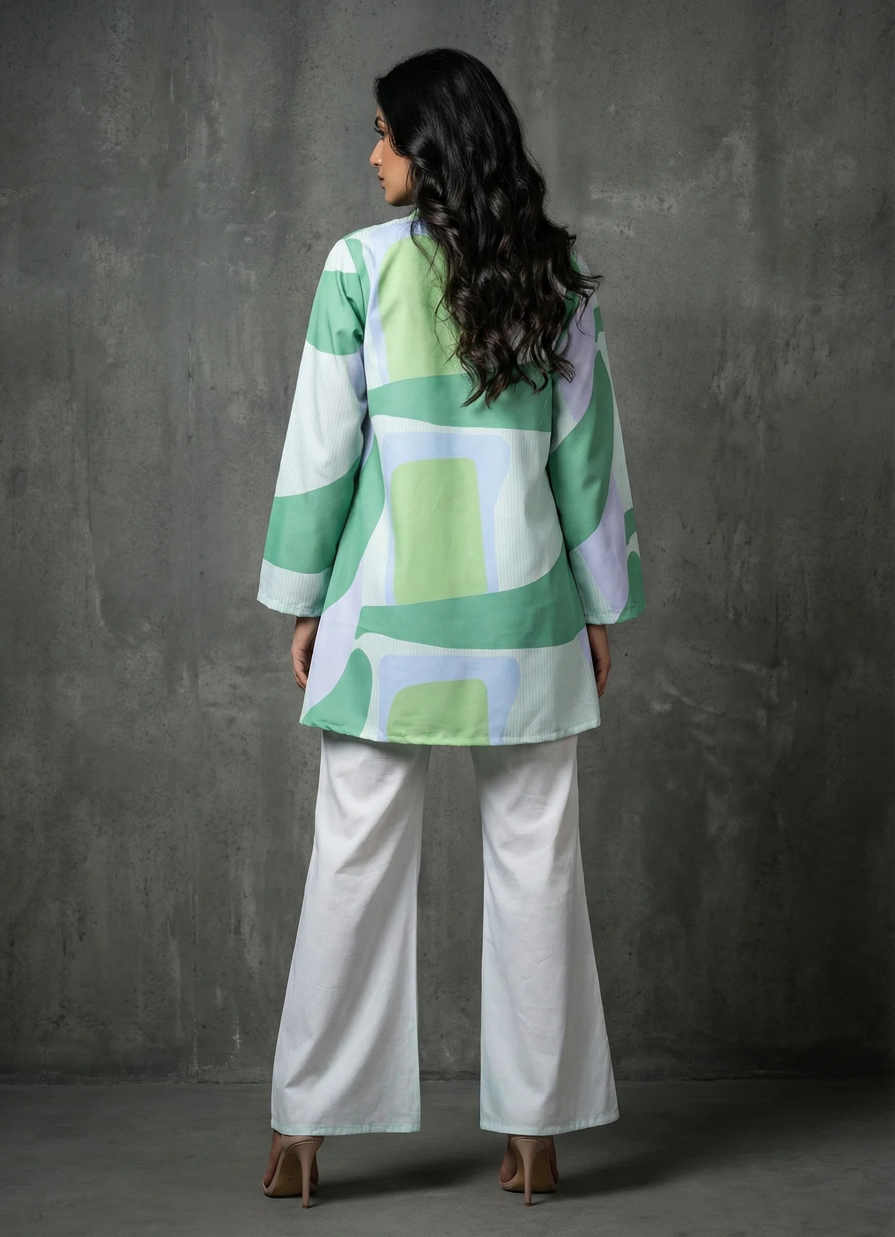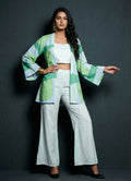 This powder blue co-ord set exudes sophistication, making it perfect for both office and occasional wear. The below-knee jacket features full sleeves and a striking abstract print, while the plain inner with a square neck offers a clean, balanced look.