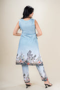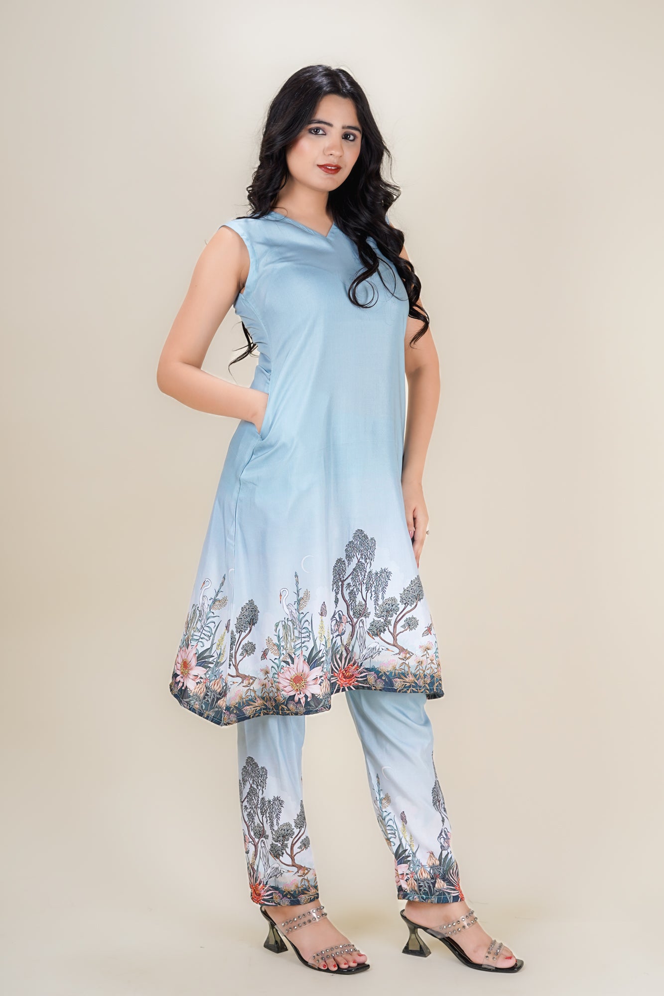 Refresh your wardrobe with this stylish powder blue kurti and palazzo set, crafted in soft and breathable Cotton blend fabric with a gentle machine wash finish. The sleeveless kurti features a flattering V-neckline and showcases a vibrant floral jungle print, adding a touch of nature-inspired charm. The knee-length styling makes it both contemporary and comfortable for all-day wear. Paired with a mint green palazzo pant adorned in floral placement print, and designed with a half-belt, half-elastic waistband, this ensemble offers effortless style and ease. Perfect for occasional and regular wear, from day outings to casual get-togethers.