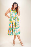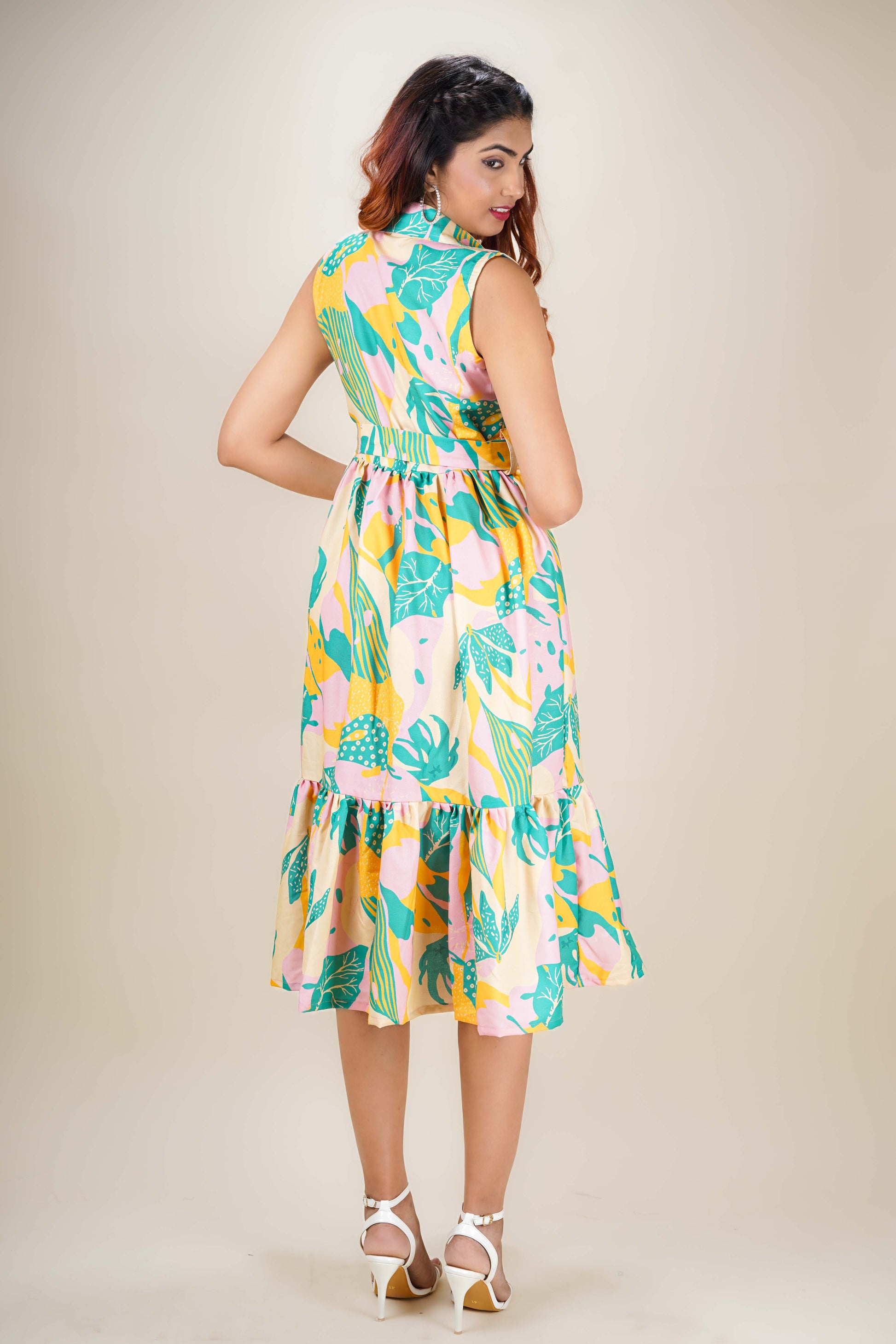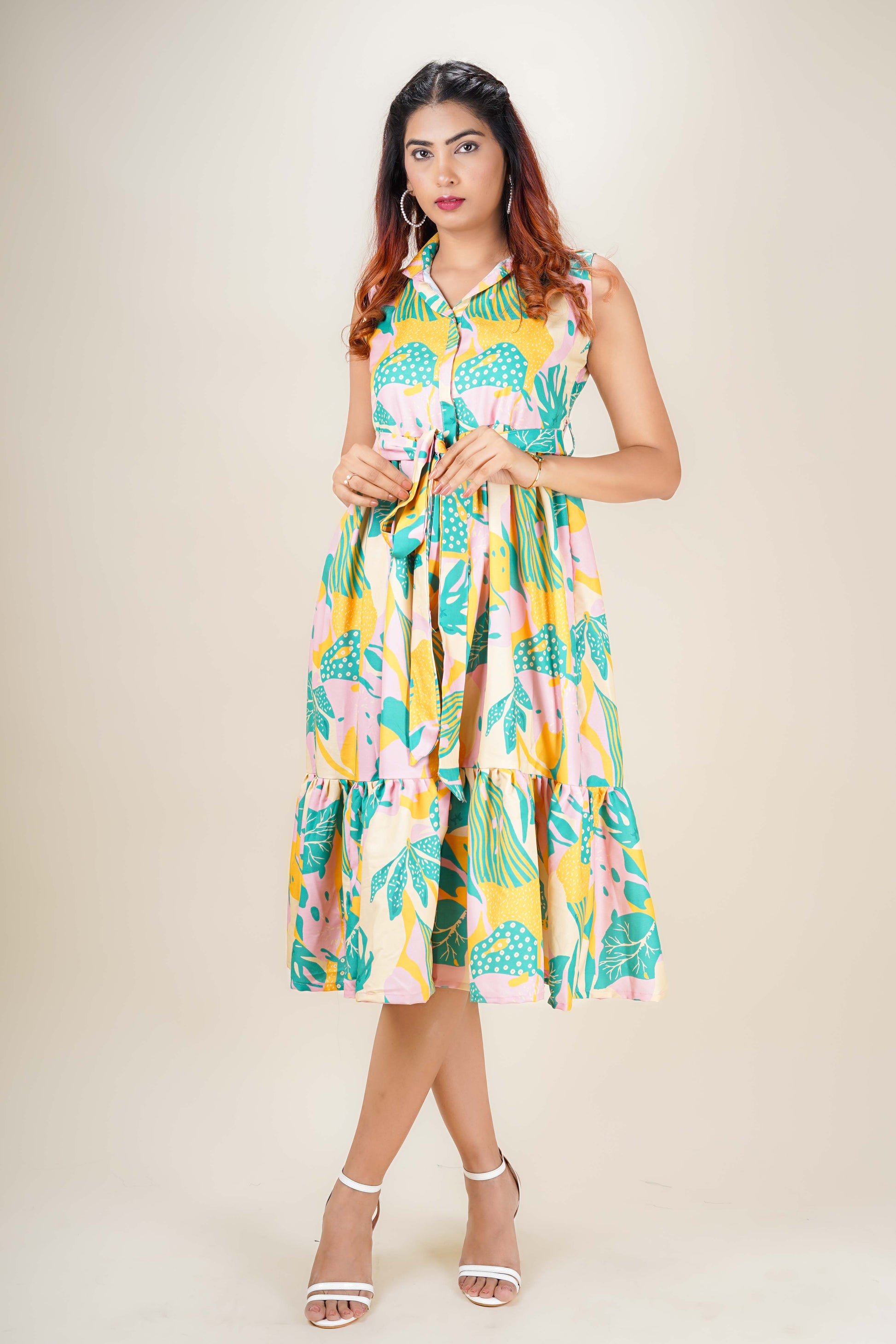 This stylish powder pink dress features a sleeveless design with an elegant overlap collar neck and a unique abstract print. Made from a comfortable Cotton Blend with digital printing, it is easy to care for with gentle machine wash. The below-knee length offers a flattering silhouette, making it ideal for both occasional and regular wear.