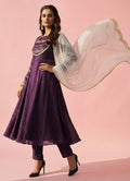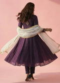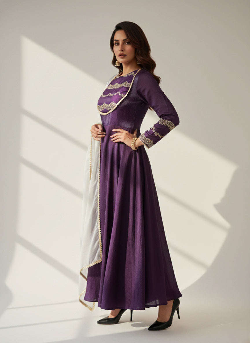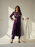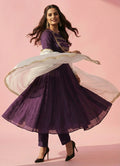 A stunning purple Anarkali set adorned with delicate floral scallop embroidery. Designed with full sleeves and a round neckline for an elegant appeal. The ankle-length Anarkali is crafted from rich organza fandy fabric. Paired with plain narrow pants featuring a half-belt, half-elastic closure. A matching dupatta completes the look with festive grace.