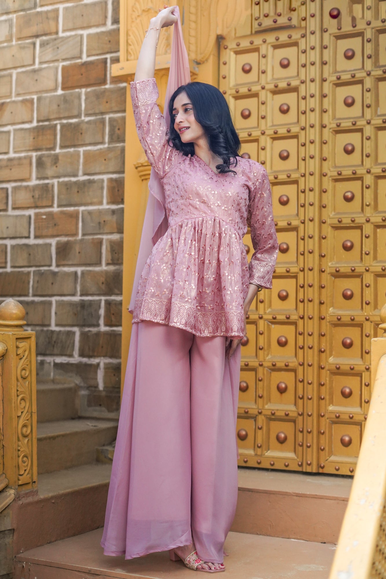 Make a statement this festive season with our Quartz Pink Self-Embroidered Organza Pleated Peplum Top, featuring rose gold foil highlighting. Paired with Silky Organza Flared Palazzo Pants and a Dupatta, this ensemble exudes timeless charm. Style with statement earrings, a delicate bracelet, and strappy heels for a memorable impression. Finish with a sleek clutch or potli bag for essentials.