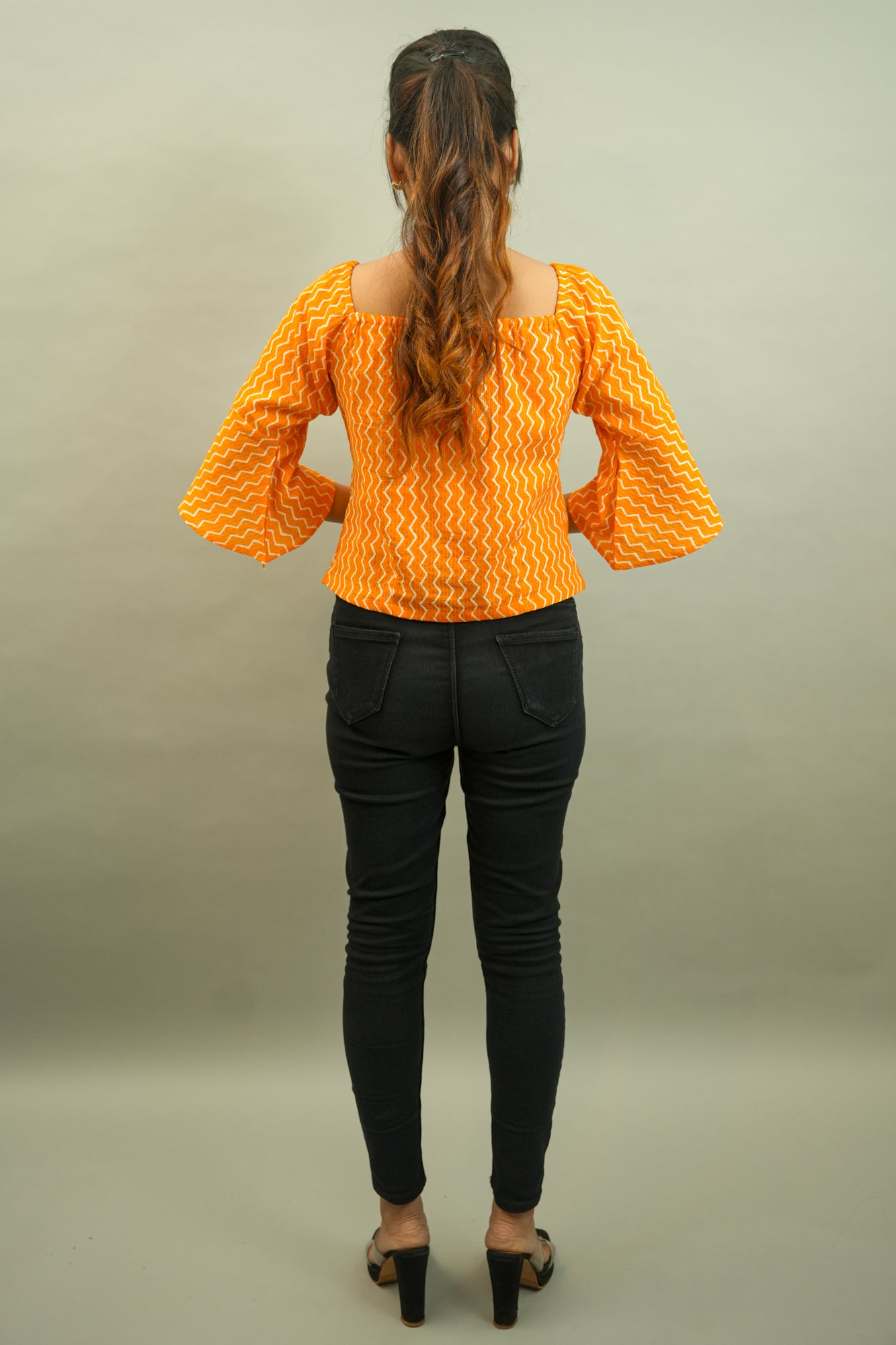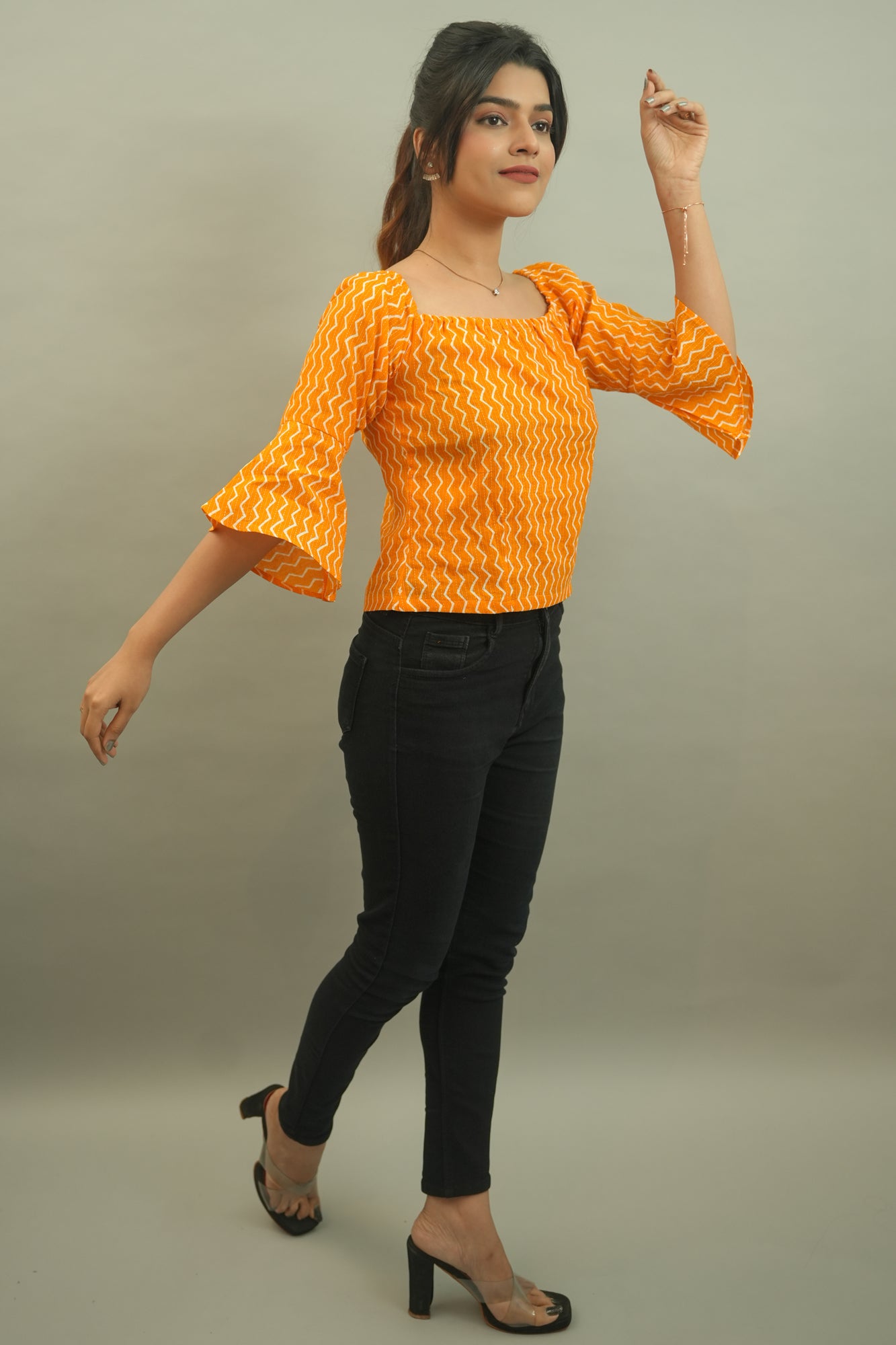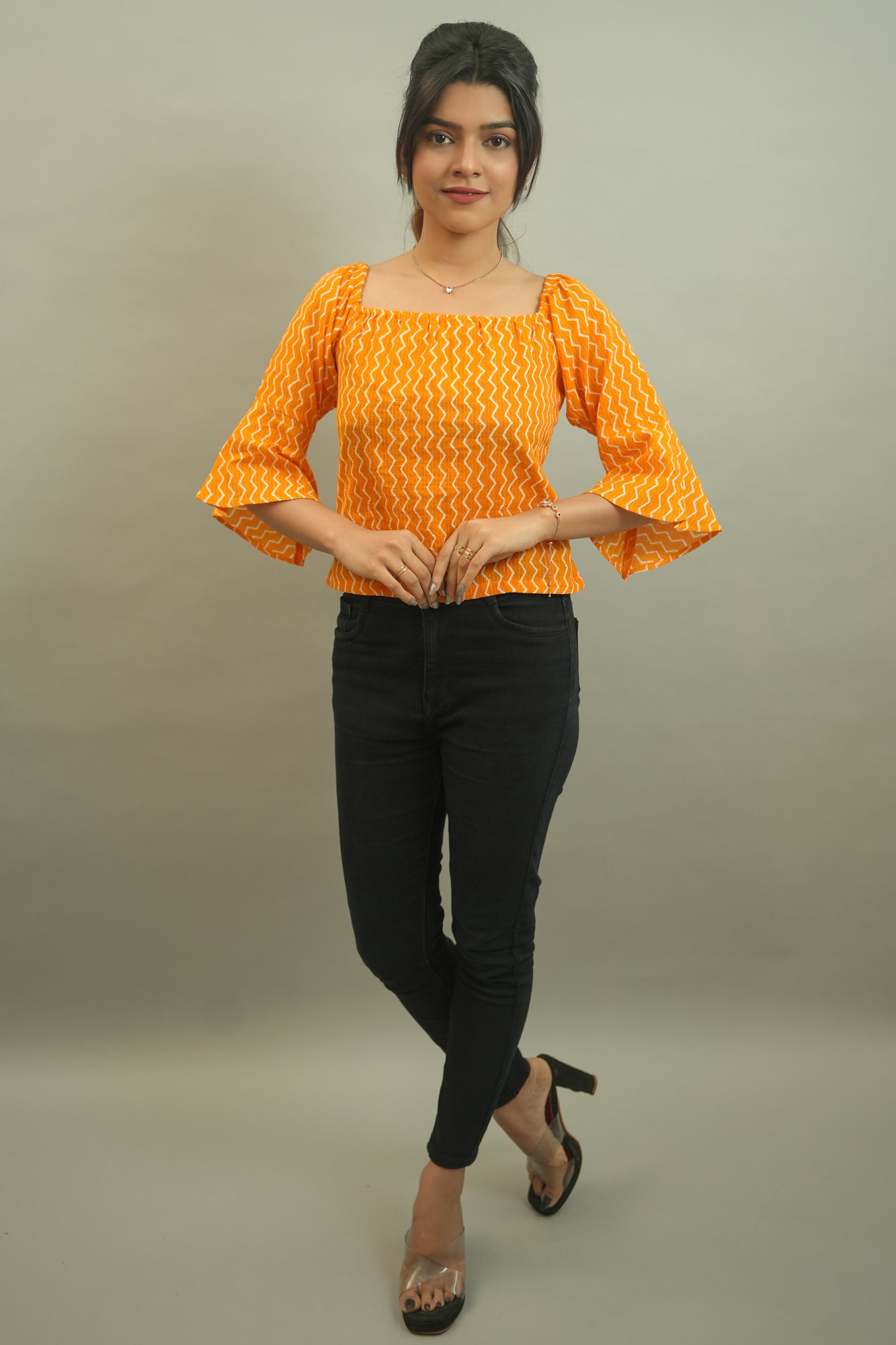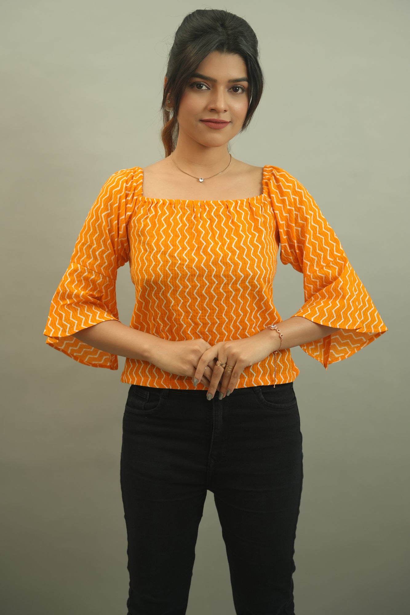 Description: A cute comfortable top with this radiant shade is perfect fit in your wardrobe. Patterned out from a triangular strip printed cotton fabric has elasticised square neck, bell bottom sleeves and is waist length with a comfy fit.