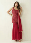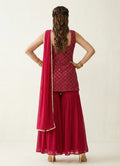 A vibrant rani pink short kurti crafted in georgette with hip-length styling. Designed sleeveless with a chic square neckline for a modern festive look. Adorned with delicate cheque embroidery that uplifts its elegant charm.
