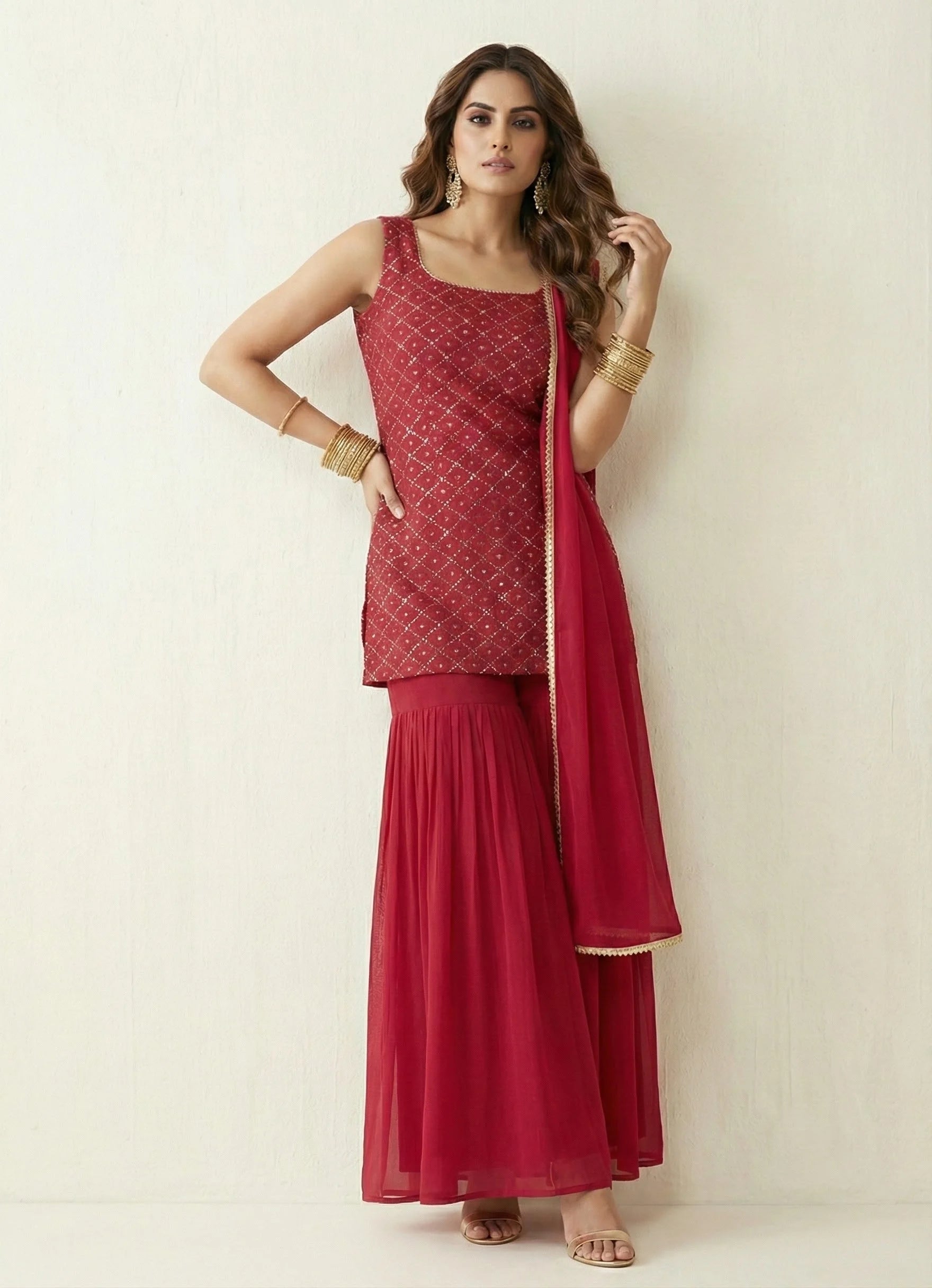 Styling: short embroiderd kurti with Georgette ghrara pant with dupatta