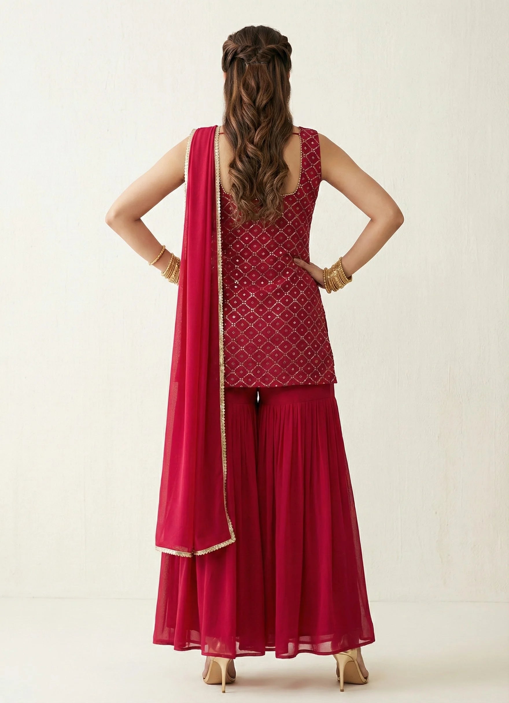 Paired with matching full-length flared gharara pants for graceful flair. A plain dupatta completes the ensemble with a balanced sophistication.