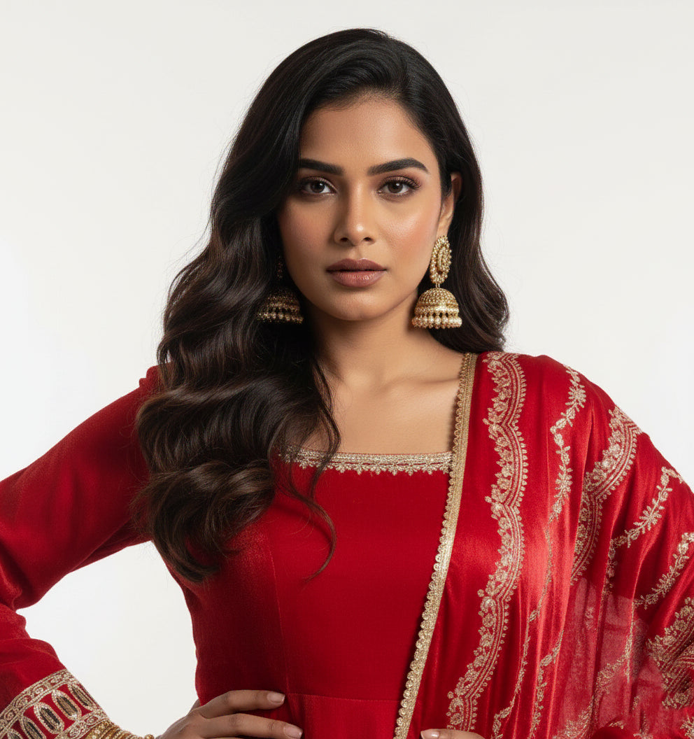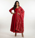 A vibrant red Anarkali set featuring exquisite floral scallop embroidery. Designed with full sleeves and a square neckline for a sophisticated look. Lace detailing on the back and sleeves adds delicate elegance. Paired with plain narrow pants for a streamlined silhouette. Completed with an embroidered dupatta for a festive touch.