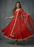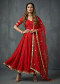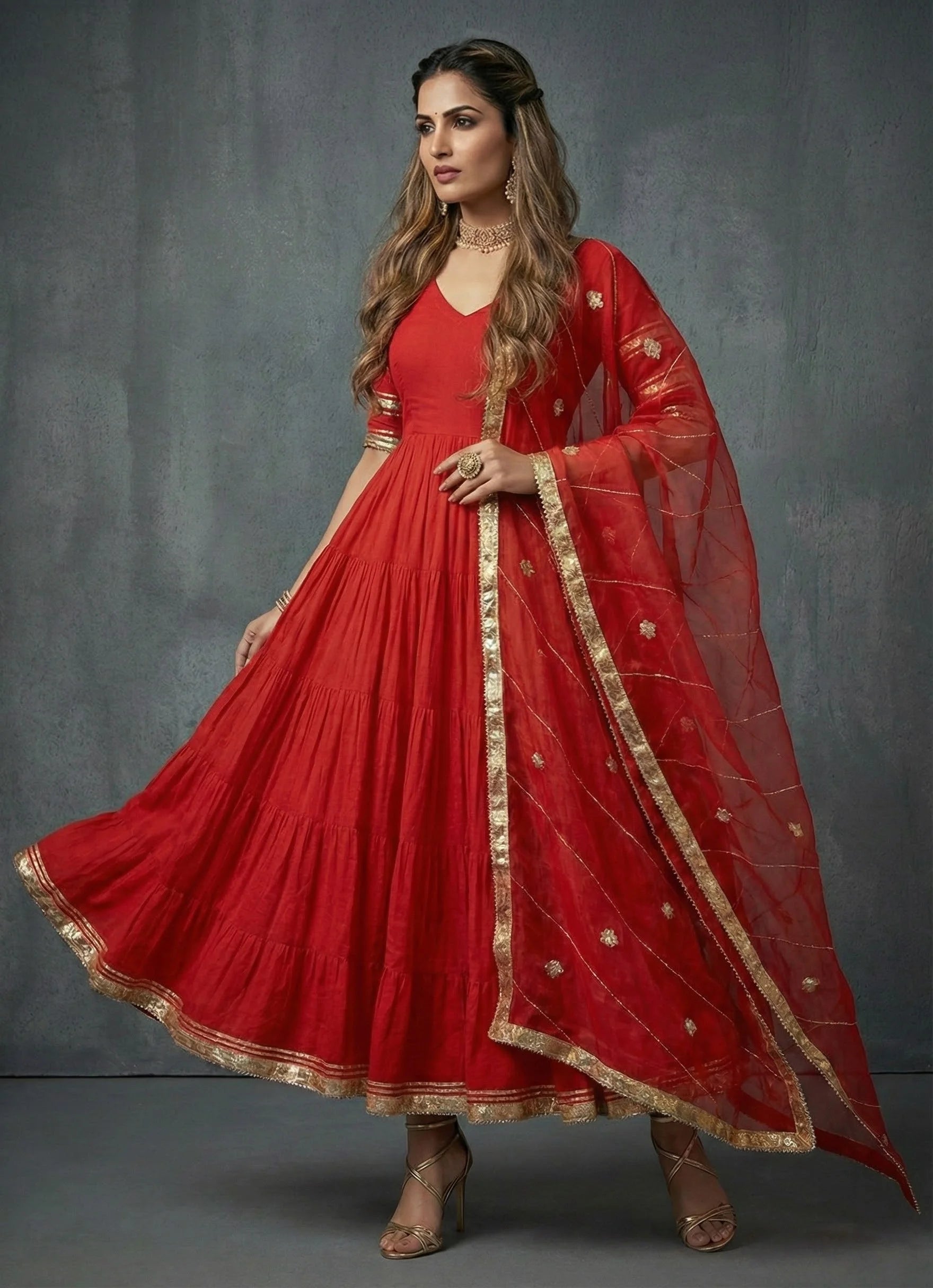 A graceful below-knee anarkali crafted in soft georgette, featuring a flattering V-neckline and elegant elbow sleeves. The outfit is paired with narrow straight pants designed with a half belt and half elastic closure for comfort and style. Completing the look is a beautifully adorned gotapatti embroidered dupatta, adding a festive charm. Perfect for both occasional and regular wear, this set blends traditional elegance with modern ease.