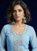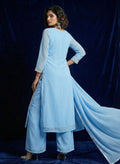 Introducing our chic River Blue Georgette Palazzo Pants and Long Dress ensemble, perfect for both casual outings and special occasions. The dress features Full sleeves adorned with a broad silver border, adding a touch of elegance to the outfit. Paired with flowy palazzo pants in a complementary river blue hue, this ensemble offers comfort and style in one. Complete the look with a plain dupatta for added versatility. Whether you're attending a daytime event or a night out, this ensemble is sure to make a statement.
