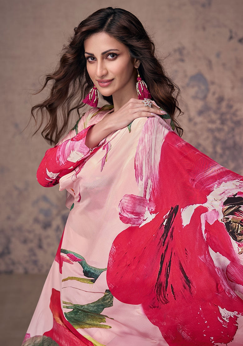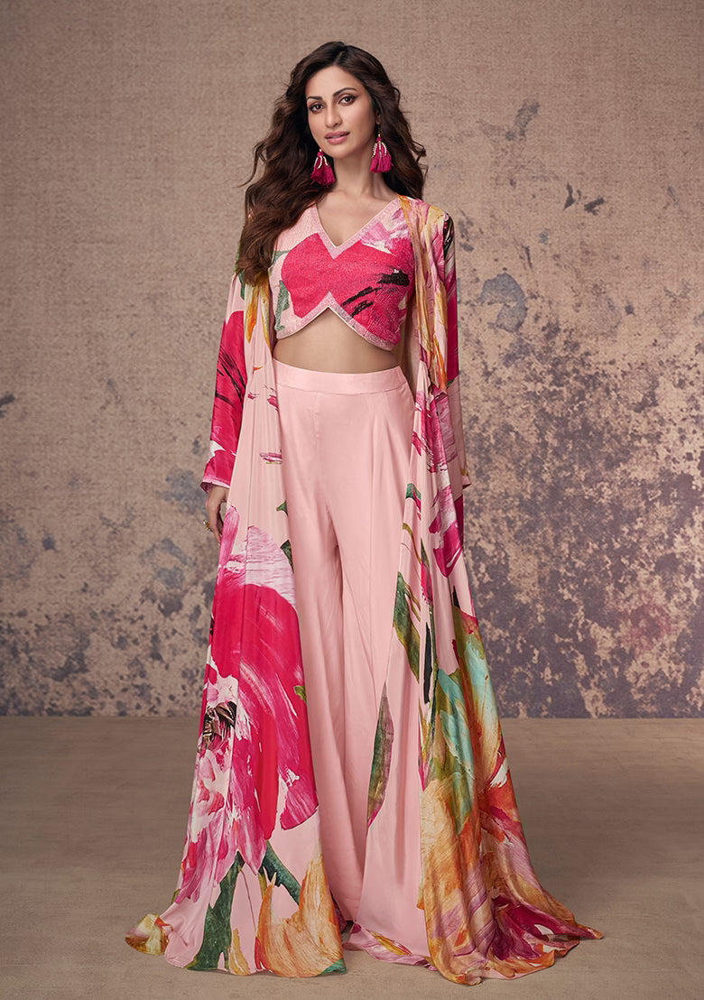 Bubblegum Pink Floral Abstract Flared Jacket Set in cotton blend fabric with V-Neck Inner & Palazzo Pant – perfect for festive and occasional wear. The floor-length flared jacket with a soft floral-abstract digital print adds a graceful charm. Paired with a plain bubblegum pink palazzo and printed inner, this ensemble blends elegance with comfort.