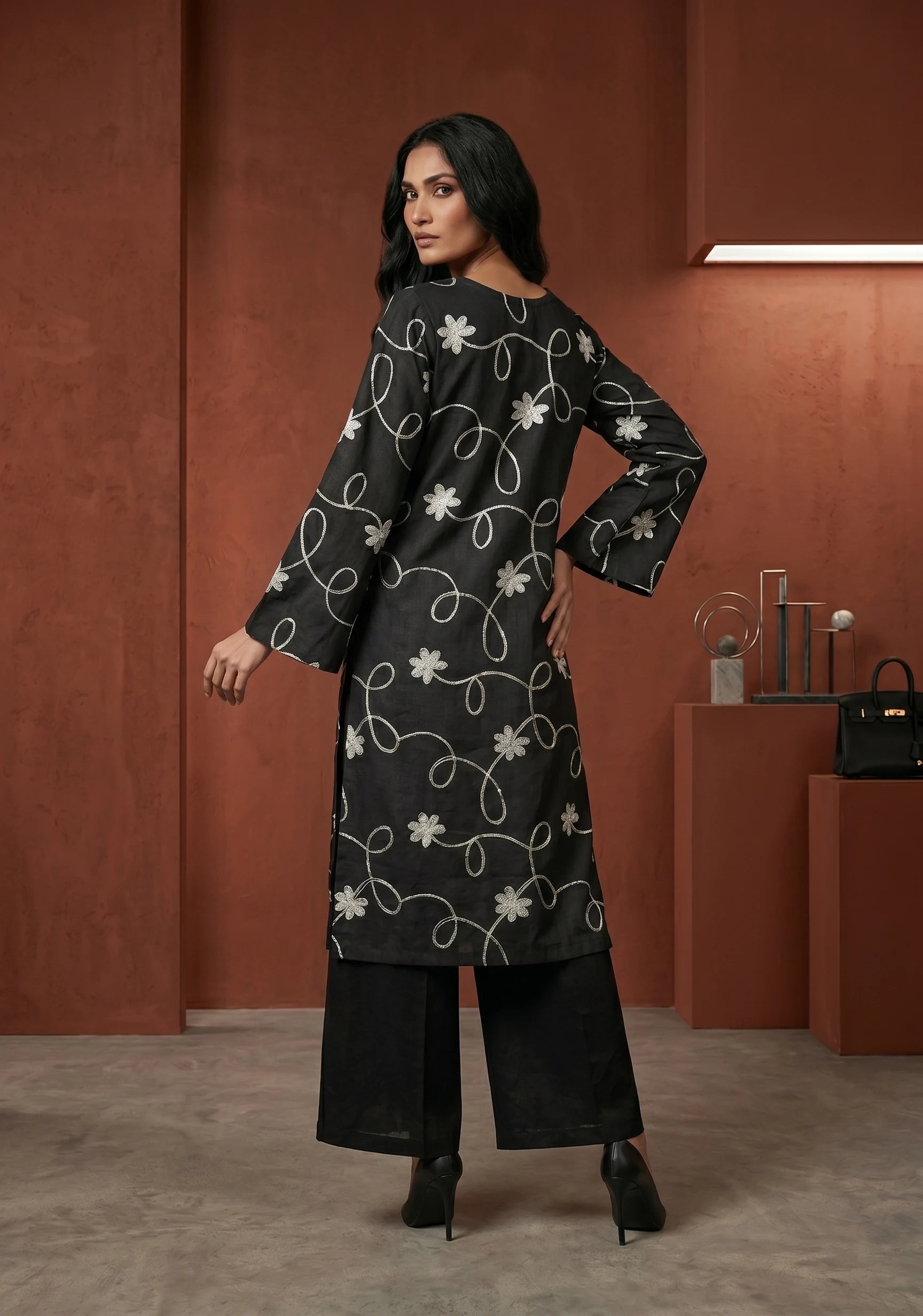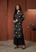 A chic black kurta set designed with delicate thread embroidery in a modern scattered pattern. Tailored in a straight silhouette and paired with wide-leg bottoms for effortless elegance. The minimal yet statement design makes it perfect for both festive and day occasions.
