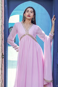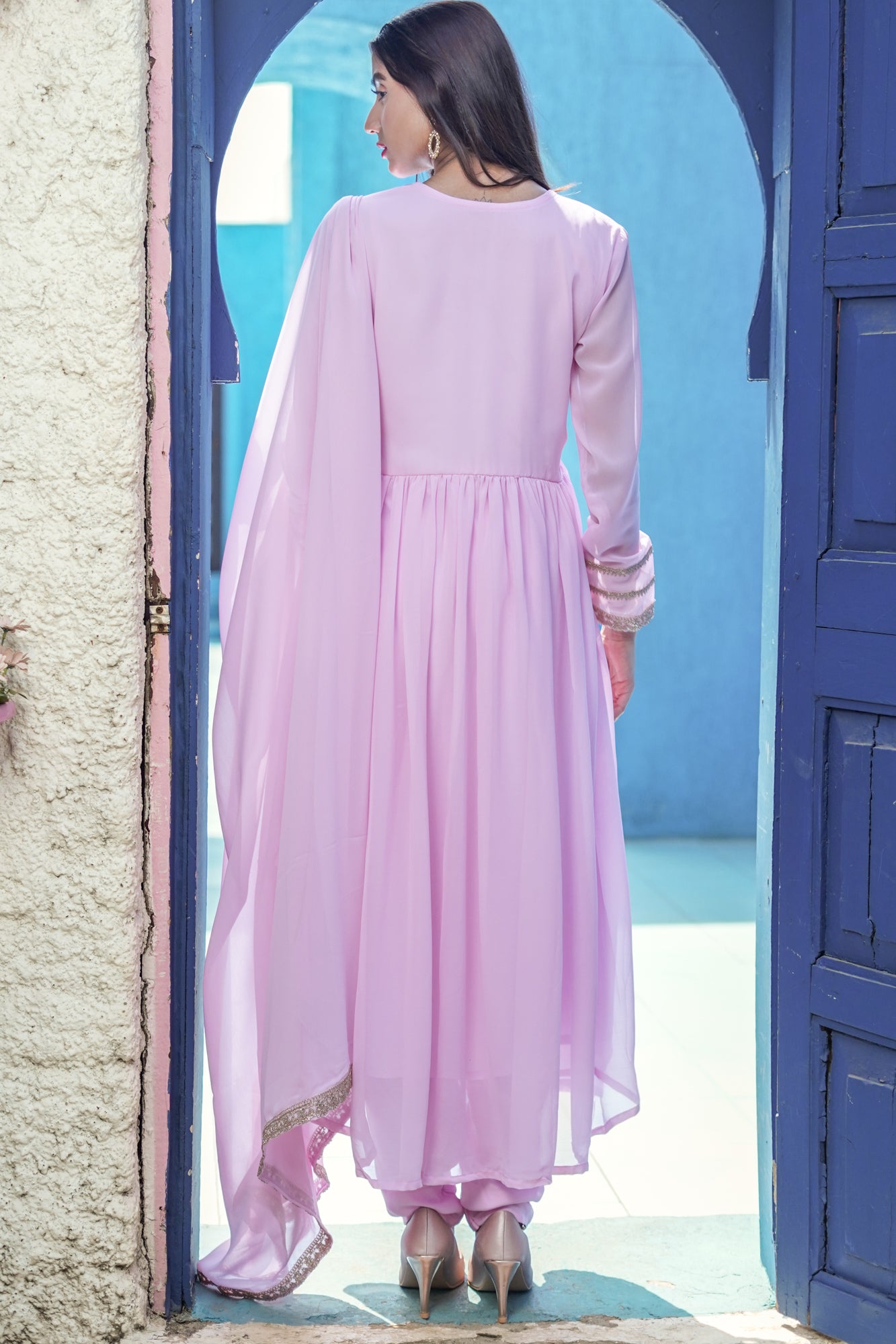 Elevate your chic ensemble with a rosy pink Alia cut Anarkali adorned with rose gold scallop lace. Paired with a plain Georgette narrow bottom pant and a matching dupatta, accessorise for a festive look with rose gold jewellery. Opt for statement pieces like a necklace or choker, complemented by matching earrings. Consider adding a delicate maang tikka or nose ring for traditional charm. Complete the look with rose gold embellished sandals or heels for added sophistication.