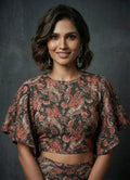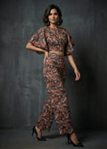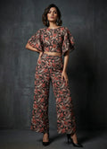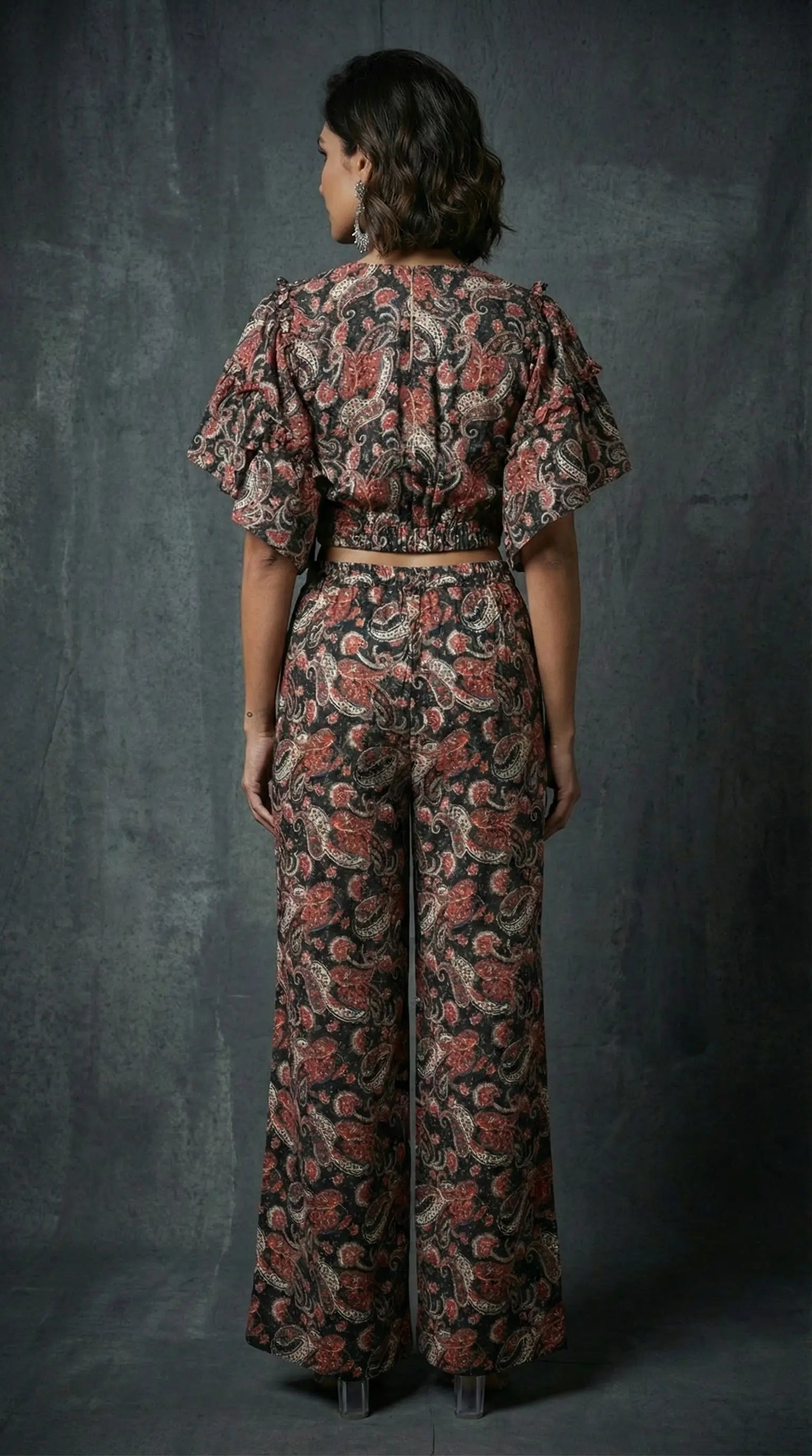 The crop top boasts a close neck, offering a modern, refined look while maintaining a professional yet fashionable appeal. Its short sleeves are enhanced with ruffled details, lending a playful and feminine touch to the design. The crop top sits just above the waist, creating a flattering silhouette when paired with the full-length pants.