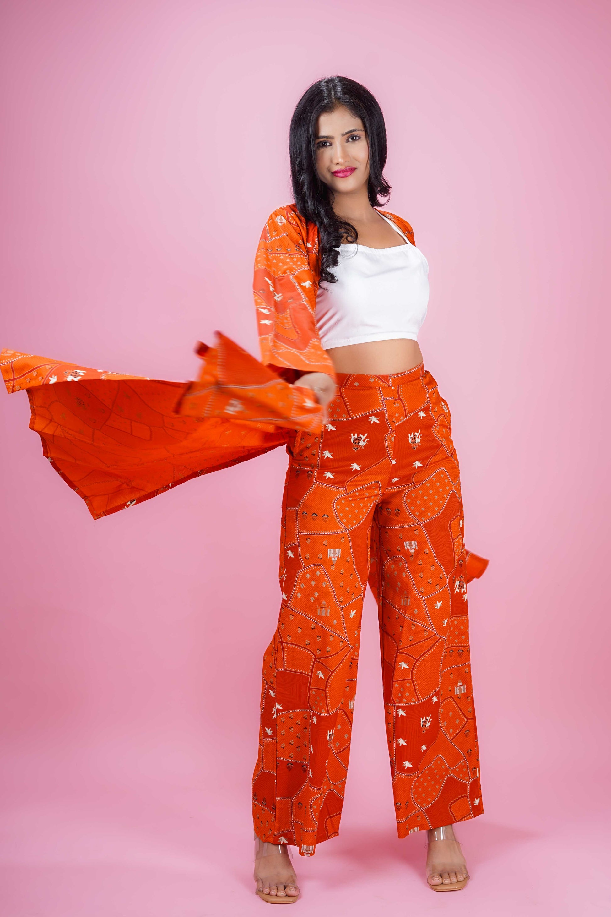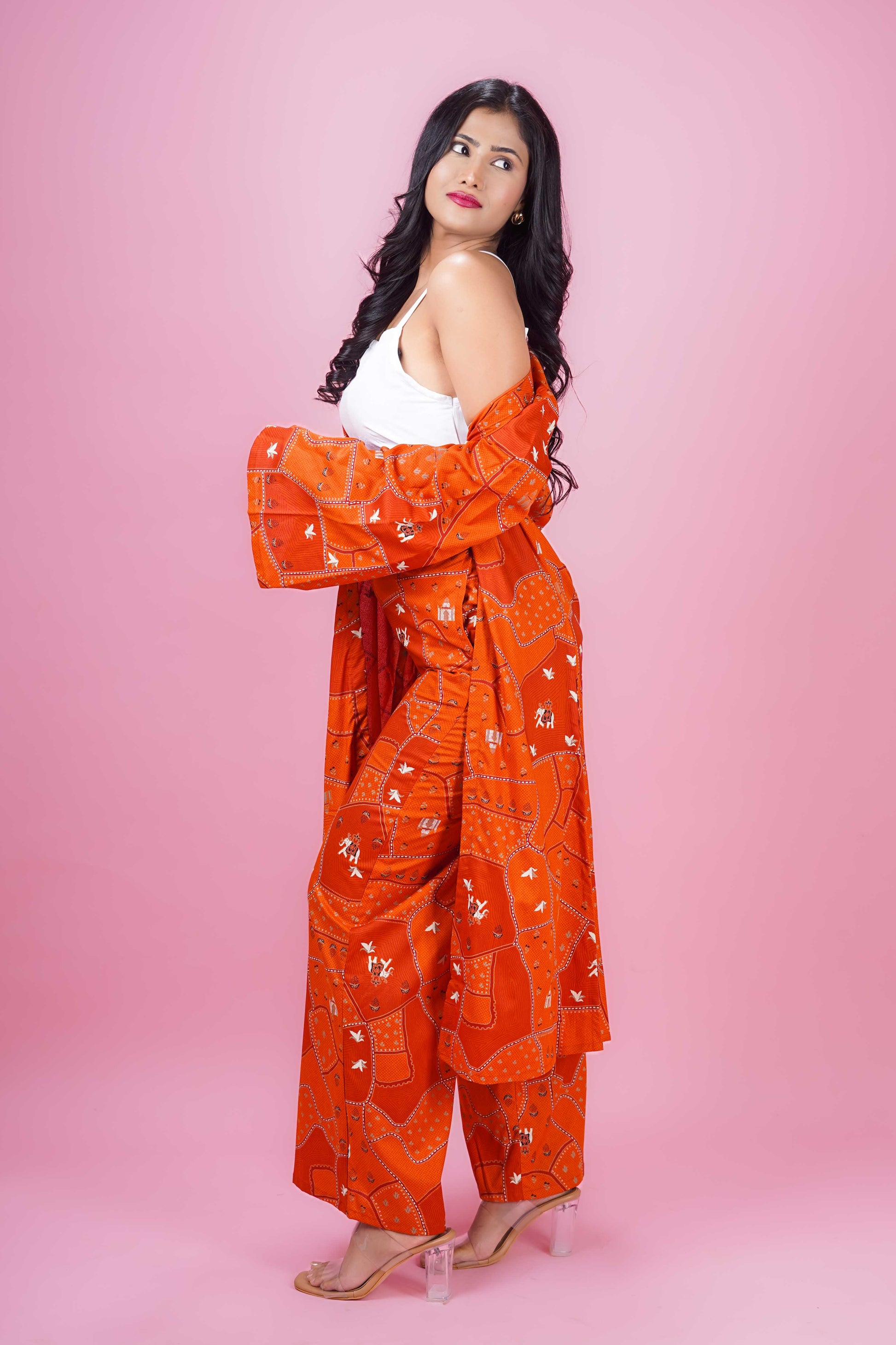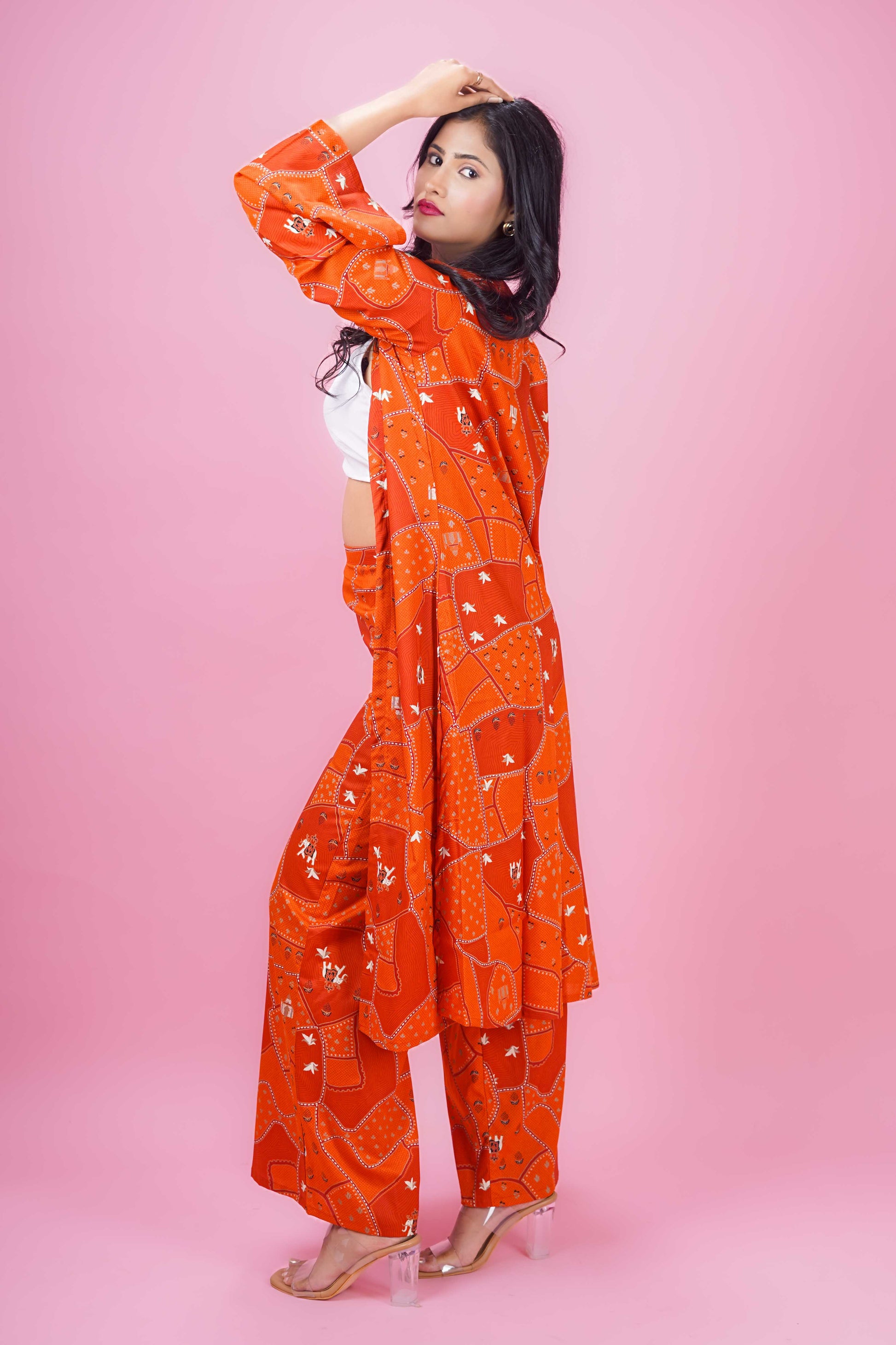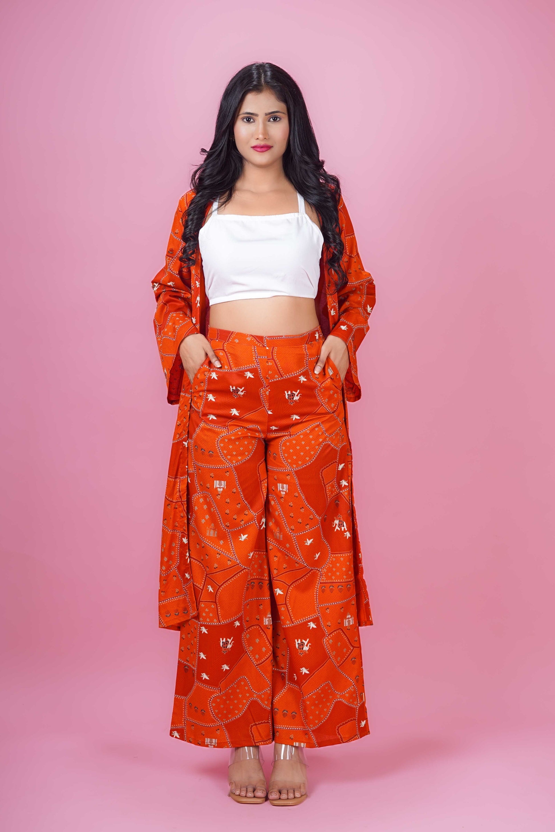 Elevate your wardrobe with the Rust Box Harmony Set, designed in a rich rust hue featuring an uneven box print. The knee-length jacket-style top showcases elegant full bell sleeves and a classic round neck, layered over a white inner for a polished look. Paired with matching full-length palazzo pants, this co-ord set offers a graceful silhouette perfect for both office and occasional wear. Made from soft Cotton blend fabric, it ensures comfort and style with easy gentle machine wash care. The pants come with a half belt and half elastic waistband for a secure yet flexible fit.