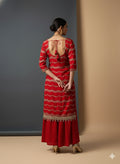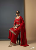 A radiant tomato red organza Fandy kurti set crafted for festive elegance. Features a round neck and ¾ sleeves with delicate floral scallop embroidery. Designed in a below knee length silhouette for a graceful flow. Paired with plain palazzo flare pants featuring a comfortable full elastic waist. Comes with a plain bordered red dupatta to complete the refined look.
