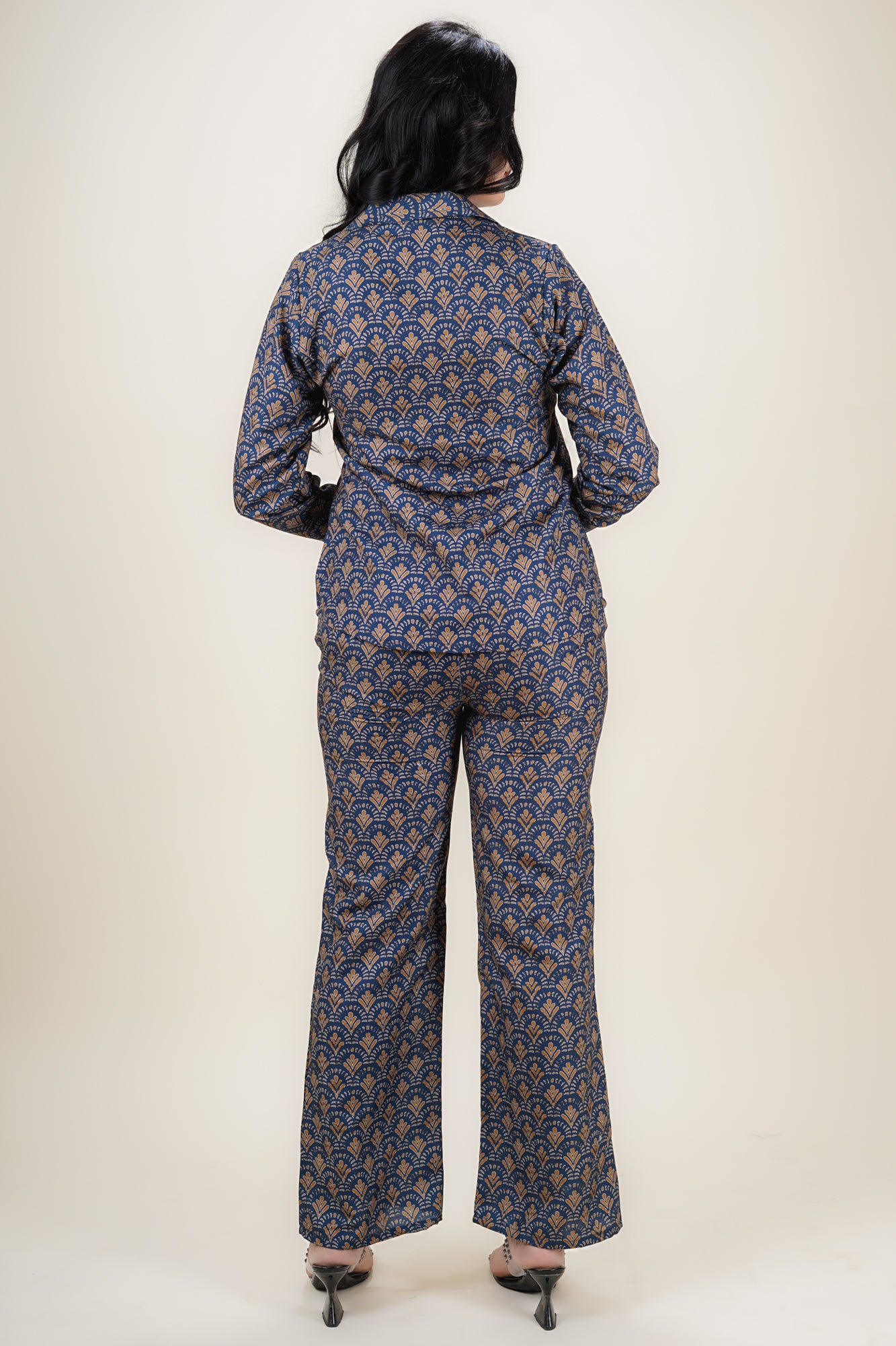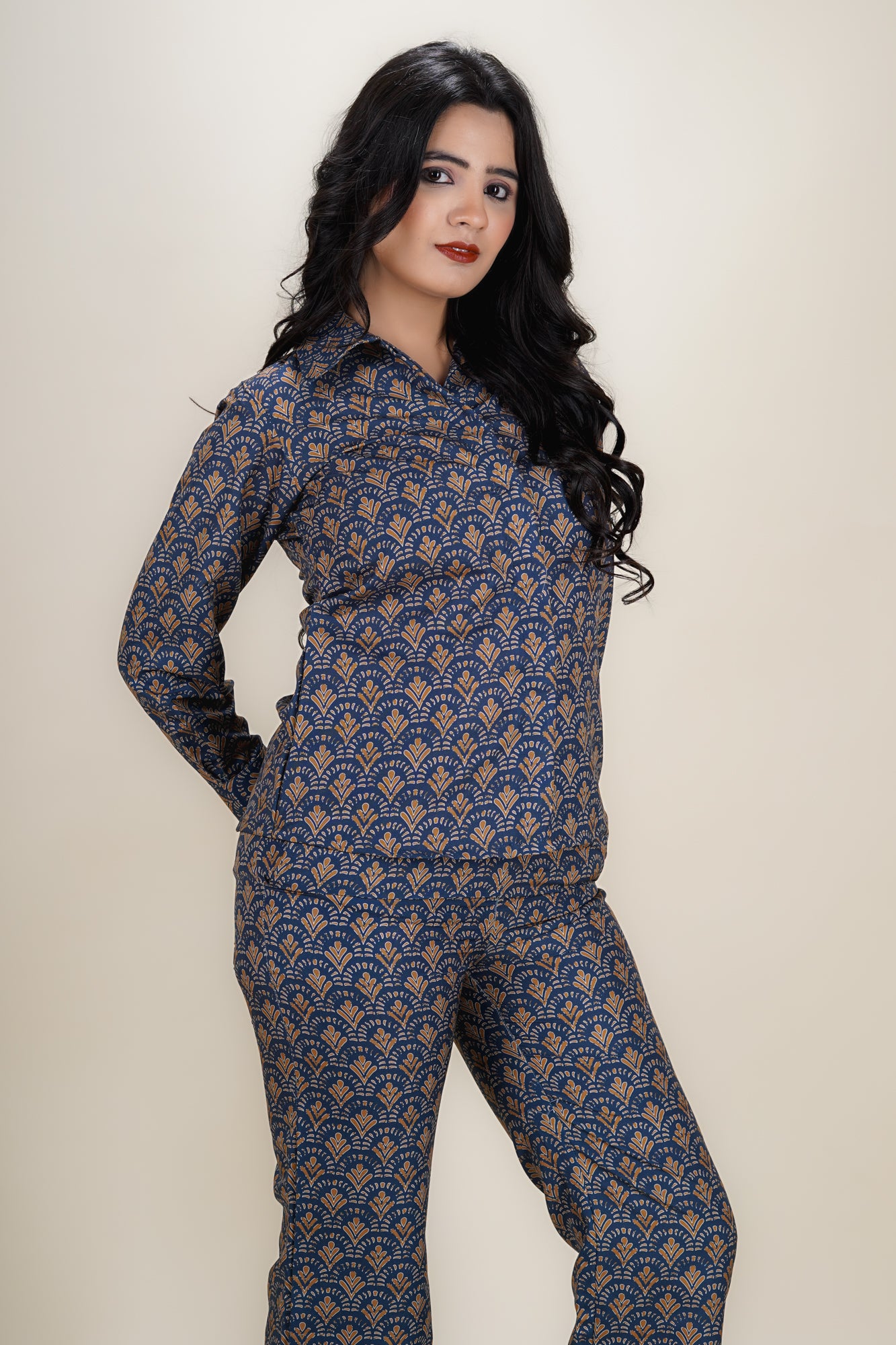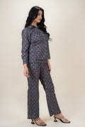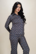 Make a bold statement with this seaworthy blue co-ord set, featuring a waist-length collared shirt with full sleeves and an all-over scale print. Crafted in breathable Cotton blend with a gentle machine wash finish, it pairs effortlessly with matching palazzo pants for a stylish look perfect for both regular days and special occasions.