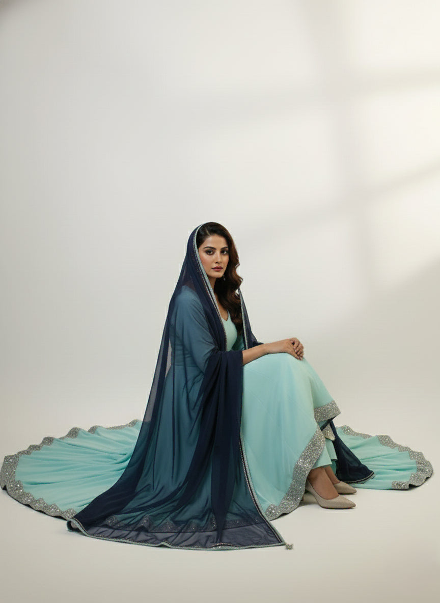 A serene sky blue Anarkali set featuring a V-neck and ¾ sleeves for graceful styling. Lace detailing on the back and sleeves adds a delicate, elegant touch. Crafted in luxurious Roman silk for the Anarkali and narrow pants for a refined finish. Paired with plain narrow pants for a streamlined, sophisticated silhouette. Completed with a contrasting navy blue organza dupatta for festive charm.