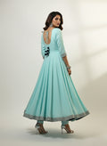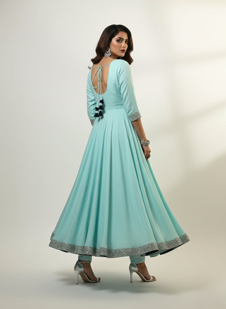 Fabric:Roman silk anarkali & pant with sky blue Organza dupatta (Gentle machine wash)