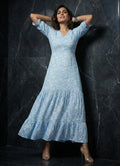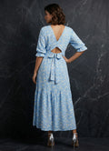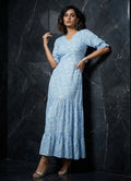 This delicate white daisy on blue is just perfect. This blue dress fashioned out from blue Cotton Blend fabric gives a gorgeous look of elegance and grace. This dress consists of a v neck, elasticised sleeves and two layers of gathers on hemline. It has a different styling on back with a v neck and bow.