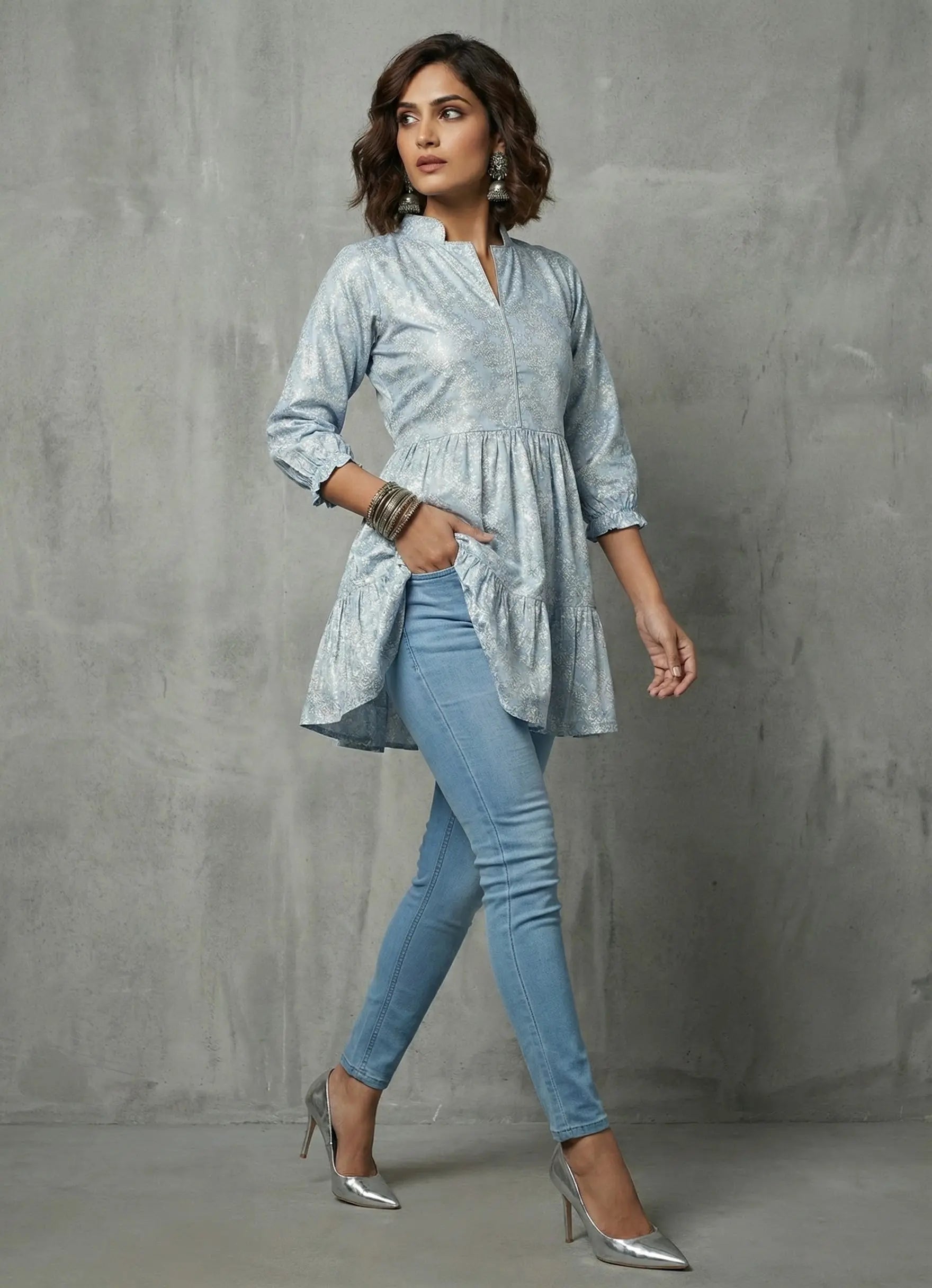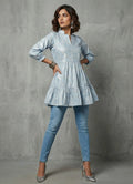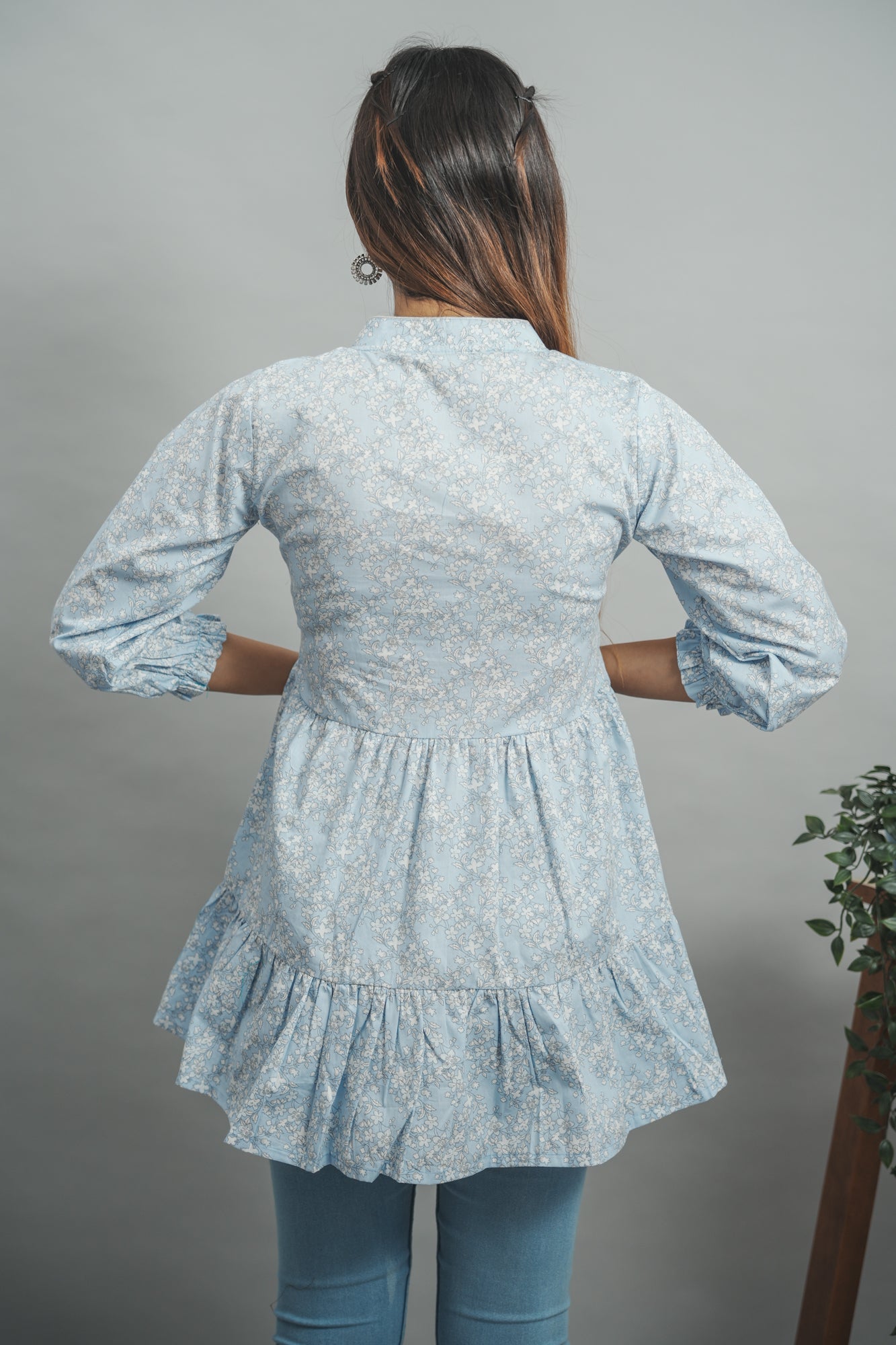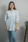 A mixture of fashion and comfort is what we all look for. This is where you will find it. A cute gathered pattern with poet sleeves, collared neck with silver piping on collar and front yoke and a flared hemline. It is below hip length top crafted out from white floral printed Cotton Blend fabric.