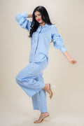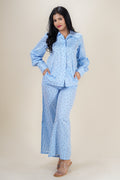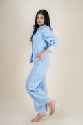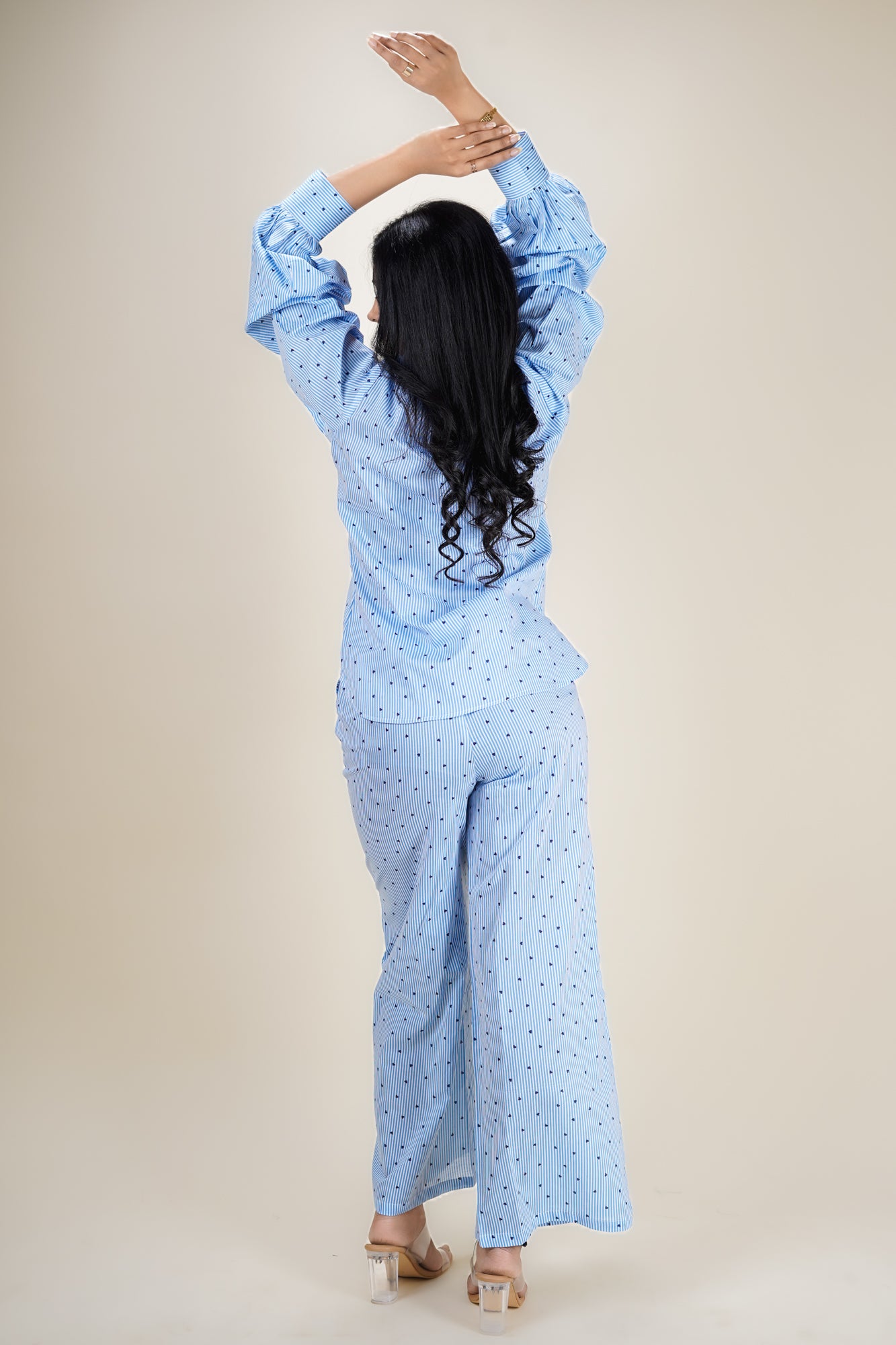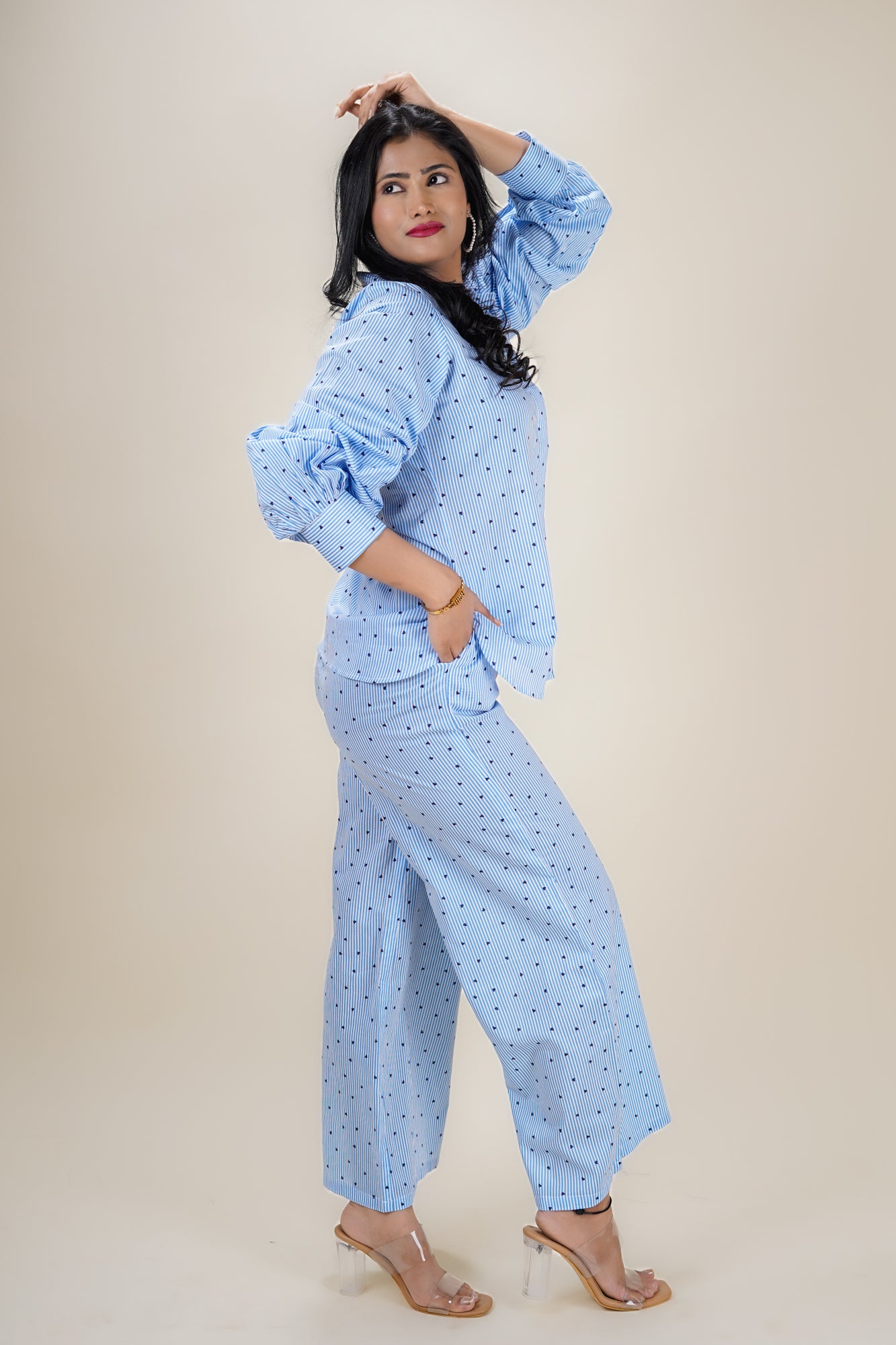 Refresh your wardrobe with this chic sky blue co-ord set adorned with classic blue stripes. The waist-length shirt is designed with stylish balloon sleeves and a smart collar neck, offering a blend of comfort and contemporary flair. Crafted from soft Cotton blend digital print fabric, it's paired with matching striped palazzo pants featuring a half belt and half elastic waistband for a relaxed fit. Perfect for both casual outings and semi-formal occasions. Gentle machine wash recommended.