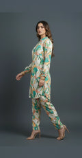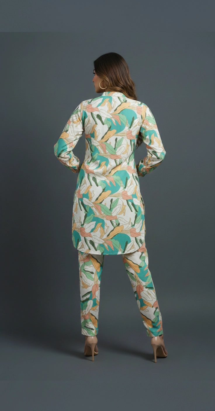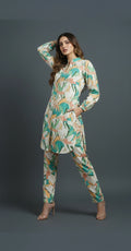 This timeless yellow set combines elegance and comfort. The top features ¾ knot sleeves and a stylish close collar neck, complemented by a abstract leaf print for a fresh, natural look. Its knee-length design makes it ideal for both casual and occasional wear. Made from soft Cotton blend with a digital print, it offers comfort and easy maintenance with a gentle machine wash.