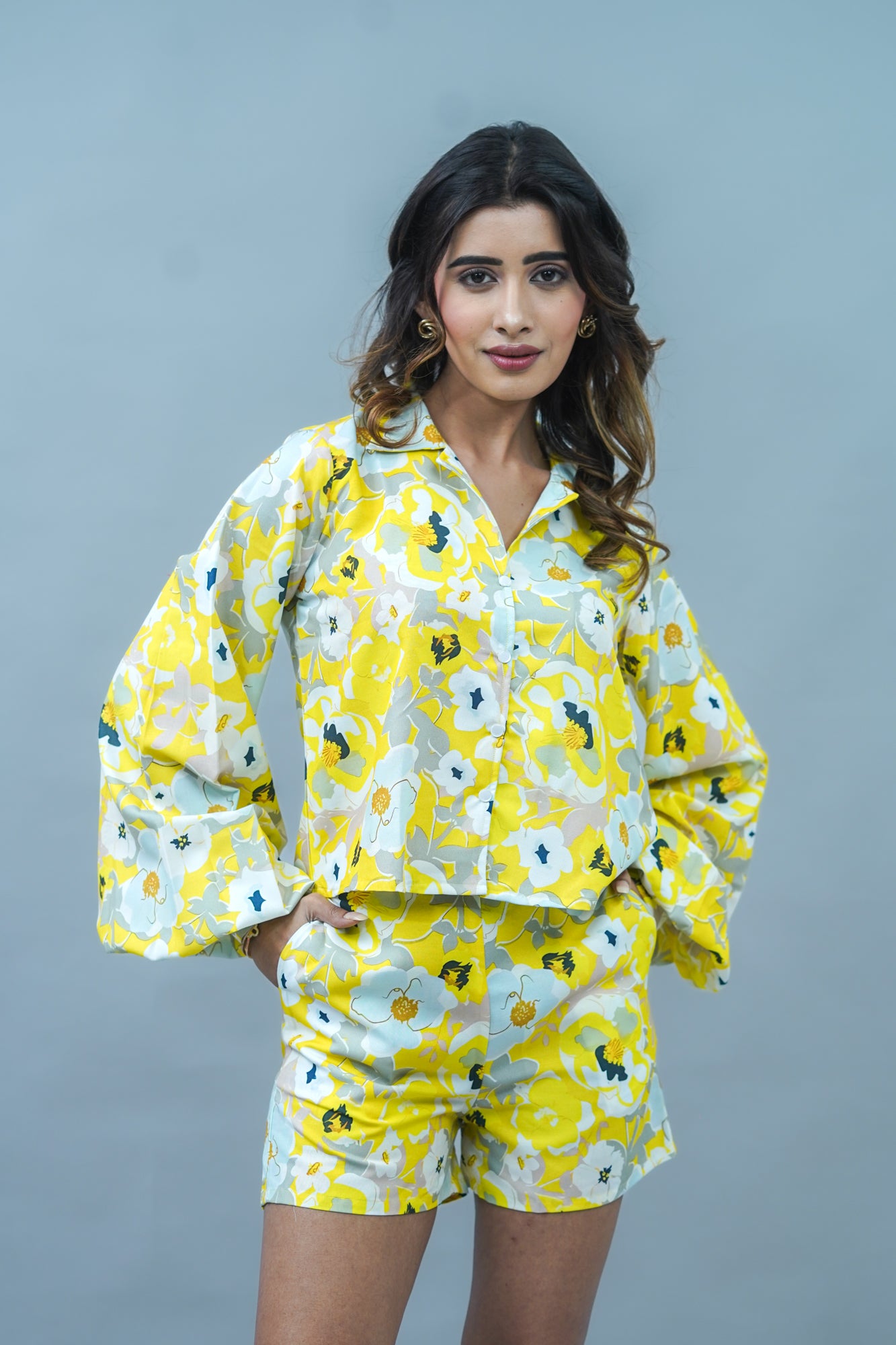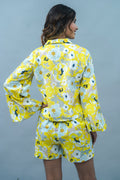 The shirt-style top features long balloon sleeves, a classic collar neck, and a vibrant floral print, with an above-knee length for a chic and versatile look. Paired with matching above-knee bottoms designed with a half-belt, half-elastic closure, this set offers a comfortable yet polished fit.