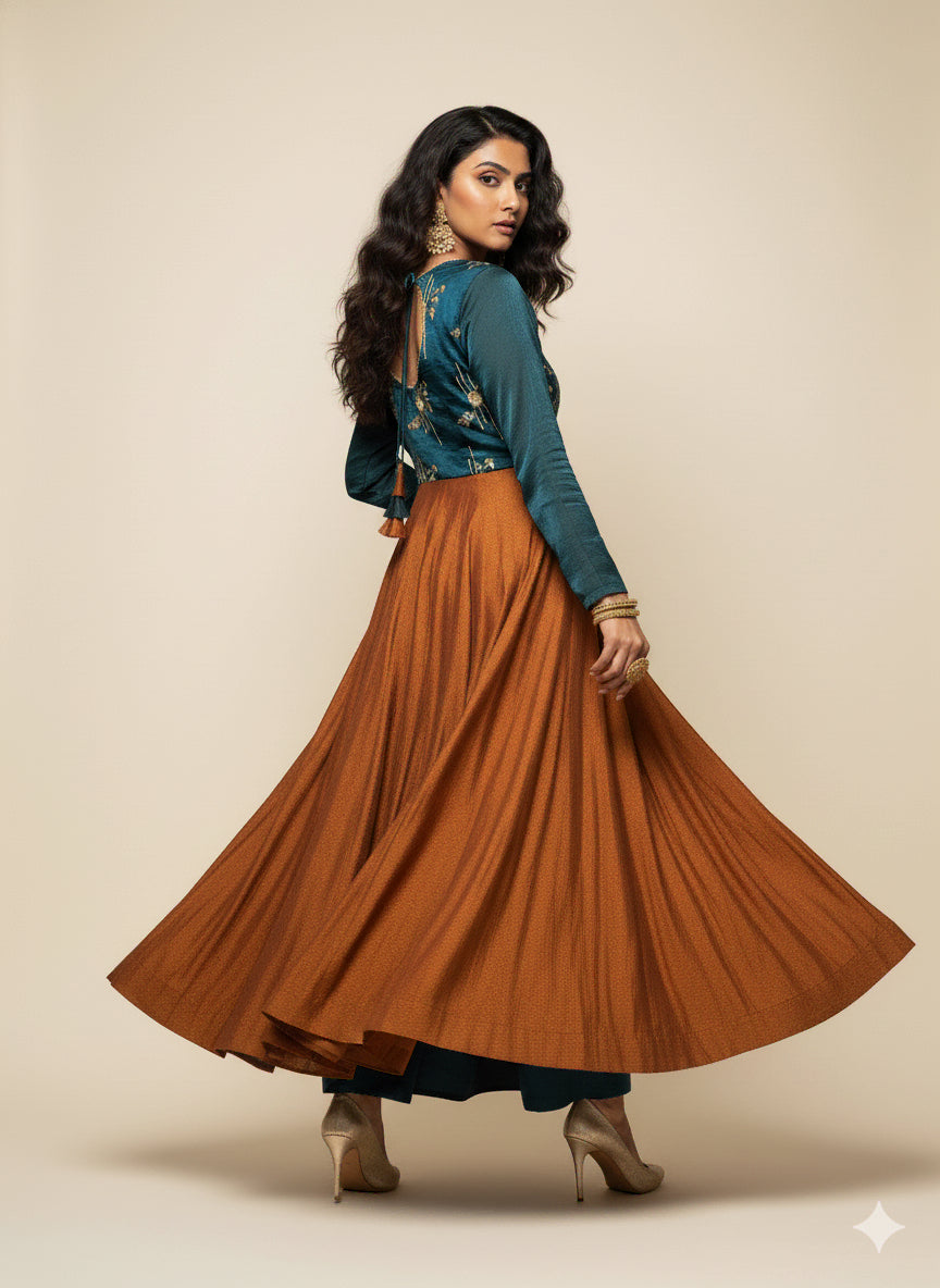 Styling: teal blue embroidered choli & plain sleeves with antique gold ghera Anarkali, teal blue pant with teal blue dupatta