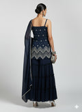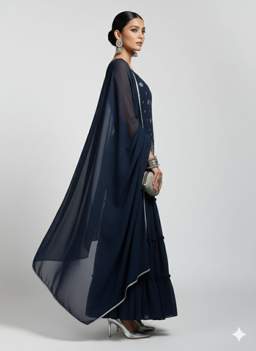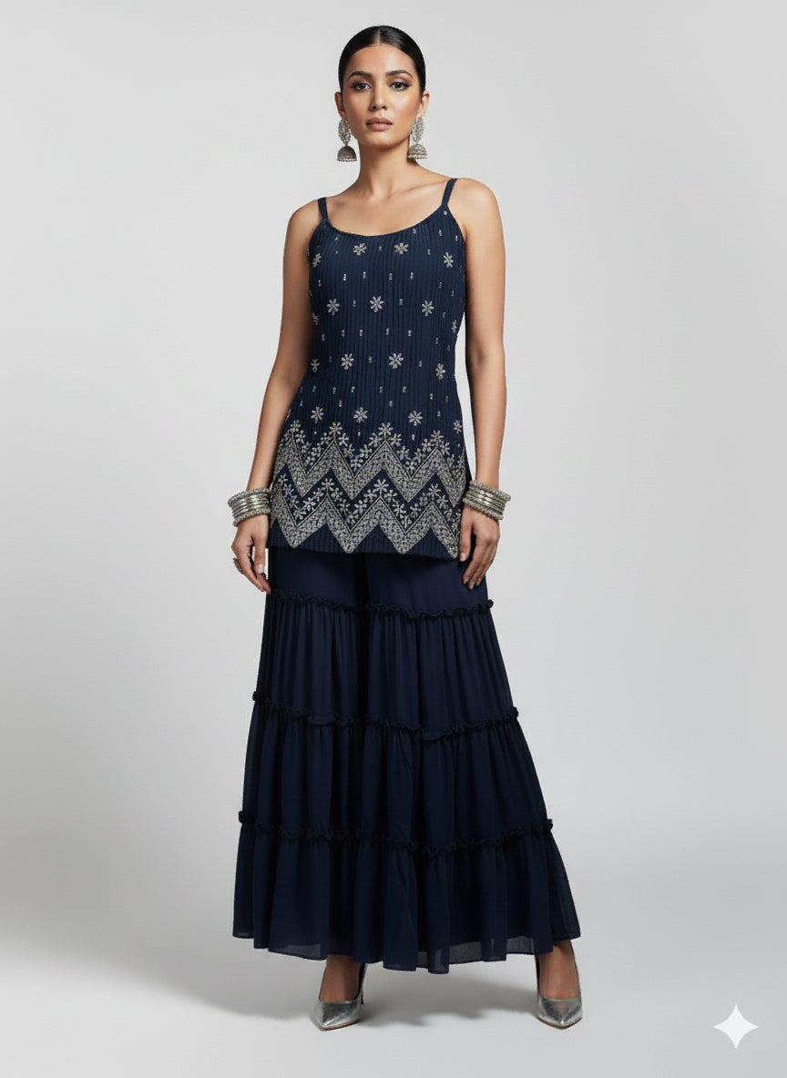A stunning teal blue hip-length kurti featuring a flattering V neckline. Designed with ¾ bell sleeves that add flow and feminine elegance. Adorned with delicate motif embroidery for a refined festive touch. Crafted in soft georgette fabric, offering comfort and graceful drape. Paired with navy blue full-length flared palazzo pants for contrast.